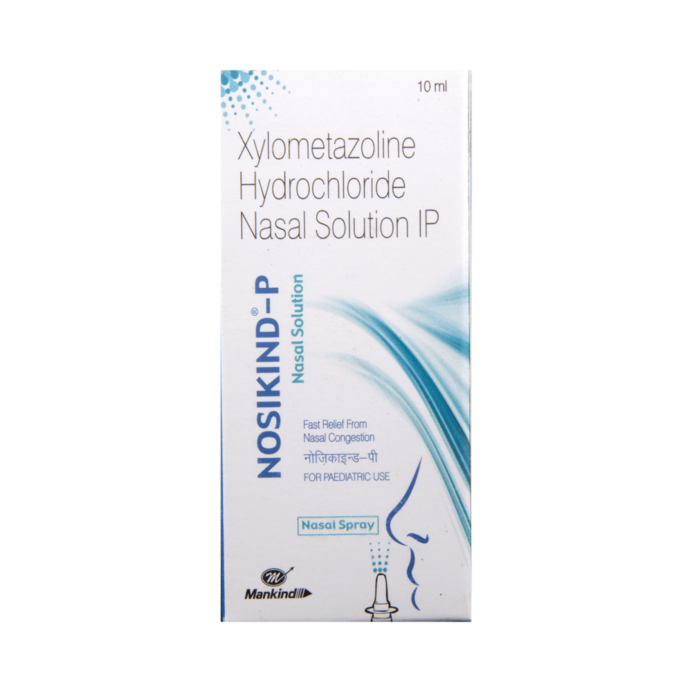 Nosikind-P Nasal Spray is a combination medicine used in the treatment of nasal congestion. It treats congestion associated with allergies, hay fever, sinus irritation and common cold. It also reduces the dryness or irritation in the nose and provides a soothing effect. Nosikind-P Nasal Spray should be used as you have been advised by your doctor. Do not use it more often or for longer than recommended. Normally you should blow your nose gently before using it, keep one nostril closed while applying the medicine into the other and then sniff hard to make sure it reaches deep into the nose. Then repeat for the other nostril. It provides relief very quickly and can last for several hours.The most common side effects are nasal discomfort, nasal irritation, sneezing, and dry nose. These are usually mild but if they bother you or do not go away, your doctor may be able to suggest ways of preventing or reducing them. Before taking this medicine, you should tell your doctor if you have any kidney or liver diseases so that your doctor can prescribe a suitable dose for you. You should also tell your doctor if you are pregnant, planning pregnancy or breastfeeding.