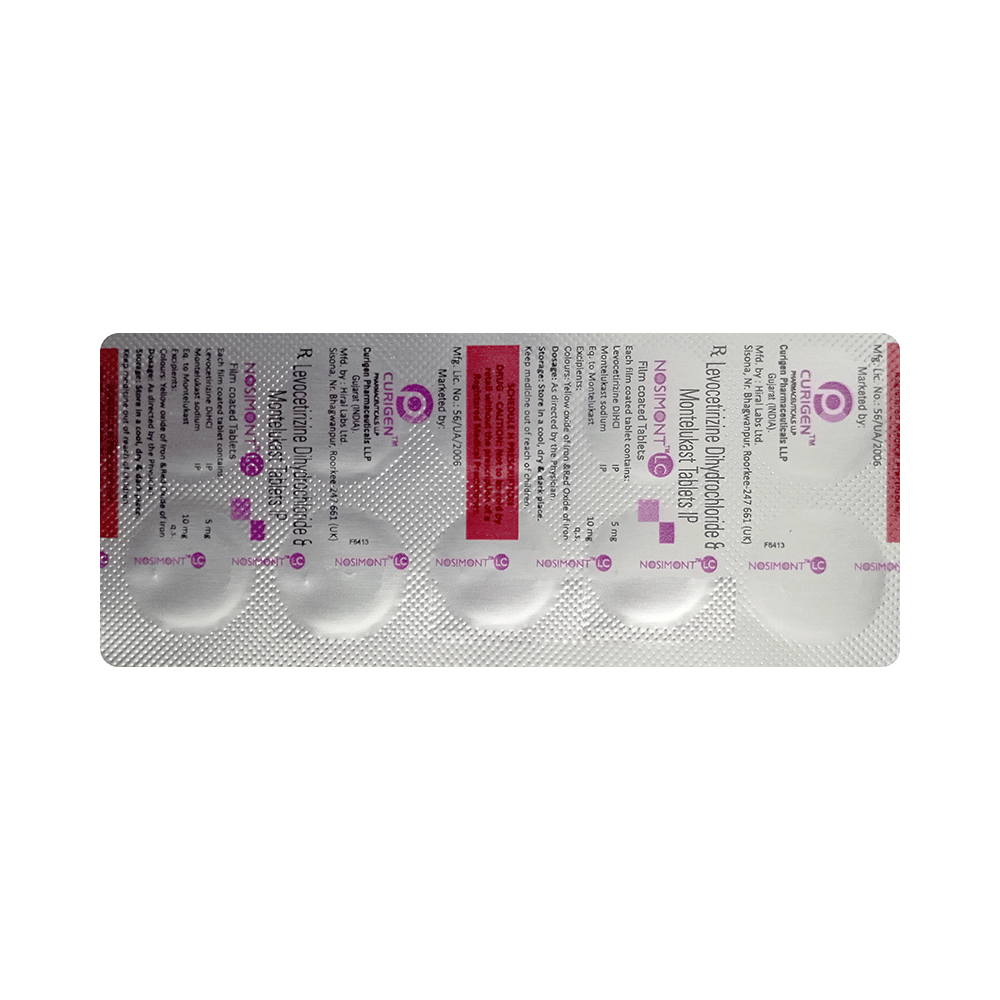 In Treatment of Allergic skin conditionsNosimont LC Tablet is effective in treating allergic skin conditions with inflammation and itching. It reduces the actions of chemicals in the body that cause inflammation of the skin. When used correctly it is a safe and effective treatment. It reduces the redness, rash, pain or itchiness caused by your skin’s reaction to an irritant. It thus improves your self-esteem and confidence as your appearance changes. Keep taking it for as long as it is prescribed to get the full benefits.In Treatment of Sneezing and runny nose due to allergiesNosimont LC Tablet is a combination medicine that provides relief from symptoms such as blocked or runny nose, sneezing and itchy or watery eyes. This will make it easier for you to go about your daily activities. It rarely has any serious side effects and you may only need to take it on days you have symptoms. If you are taking it to prevent getting symptoms you should use it regularly to get the most benefit.In Treatment of Hay feverHay fever, also called allergic rhinitis, causes cold-like signs and symptoms, such as a runny nose, itchy eyes, congestion, sneezing and sinus pressure. The only difference is that in hay fever, these symptoms are not produced due to a virus but are simply allergic responses of our body to allergens (allergy causing agents such as pollen). Nosimont LC Tablet is used to provide relief from these symptoms of hay fever. It works by blocking the release of the chemical substance responsible for producing such allergy symptoms. Nosimont LC Tablet is a safe medicine which helps treat hay fever and makes us feel at ease.show moreshow less