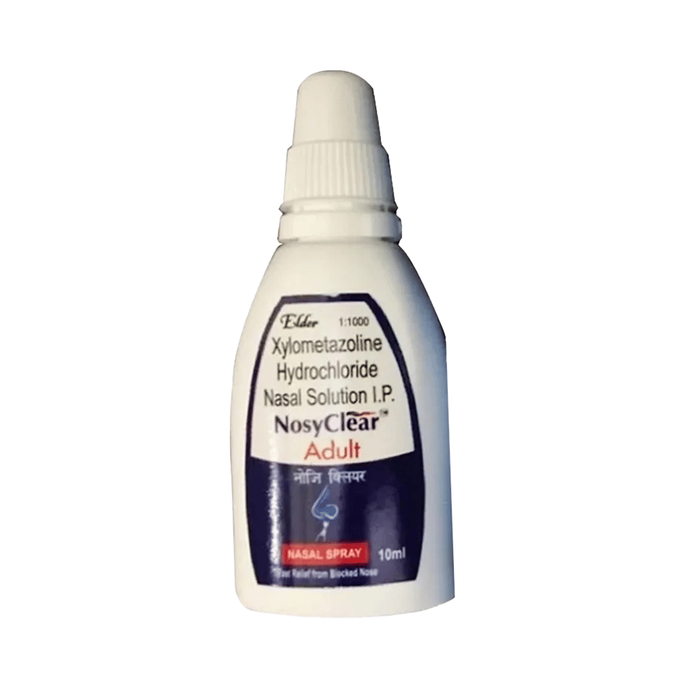 Nosy Clear Adult Nasal Drops is a medicine used to treat nasal congestion (blocked nose) caused by the common cold or flu, hay fever, and other allergies. It shrinks blood vessels in your nose to relieve nasal congestion and blockage. Nosy Clear Adult Nasal Drops should be used as you have been advised by your doctor. It provides only temporary relief so do not use it more often or for longer than recommended. Normally you should blow your nose gently before using it, keep one nostril closed while applying the medicine into the other, and then sniff hard to make sure it reaches deep into the nose. Then repeat for the other nostril. It provides relief very quickly and can last for several hours. If you use this medicine too often or for too long, it may worsen your symptoms rather than improve them.The most common side effects are burning sensation in the nose and throat, local irritation, nausea, headache, and dry nose. These are usually mild but if they bother you or do not go away, your doctor may be able to suggest ways of preventing or reducing them.It is generally a safe medicine but, before taking it, talk to your doctor about any health problems you have such as heart problems or high blood pressure (hypertension) or overactive thyroid gland or glaucoma, or prostate enlargement. Let your doctor know about any other medicines you are taking to make sure you are safe. Ask your doctor for advice before using this medicine if you are pregnant or breastfeeding.
