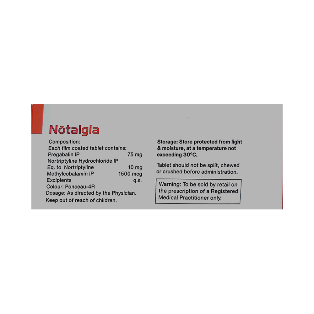 Notalgia Tablet is a combination of three medicines: Pregabalin, Nortriptyline and Methylcobalamin. Pregabalin is an alpha 2 delta ligand which decreases pain by modulating calcium channel activity of the nerve cells. Nortriptyline is a tricyclic antidepressant which increases the levels of chemical messengers (serotonin and noradrenaline) that stop the movement of pain signals in the brain. Methylcobalamin is a form of vitamin B which helps in the production of myelin, a substance that protects nerve fibers and rejuvenates damaged nerve cells. Together, they relieve neuropathic pain (pain from damaged nerves).