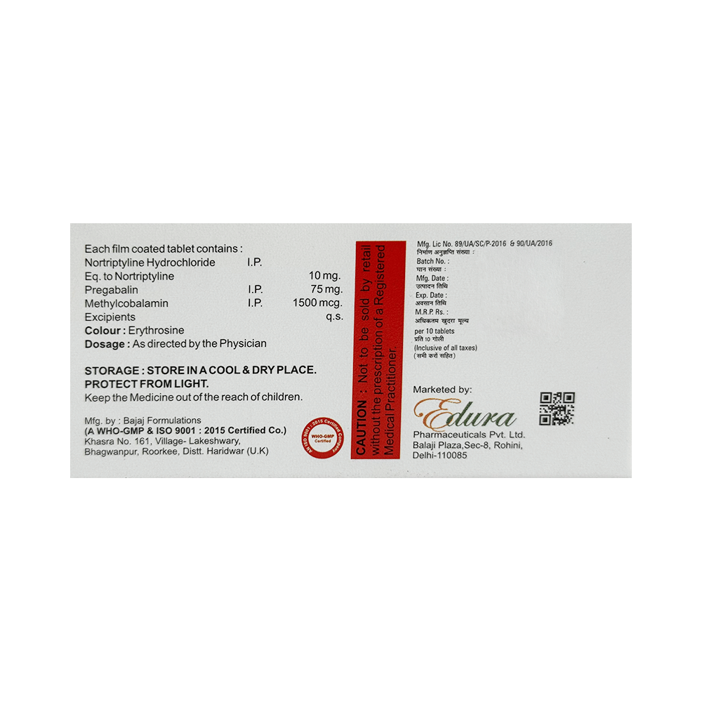 Salt Composition: Pregabalin (75mg) + Nortriptyline (10mg) + Methylcobalamin (1500mcg)