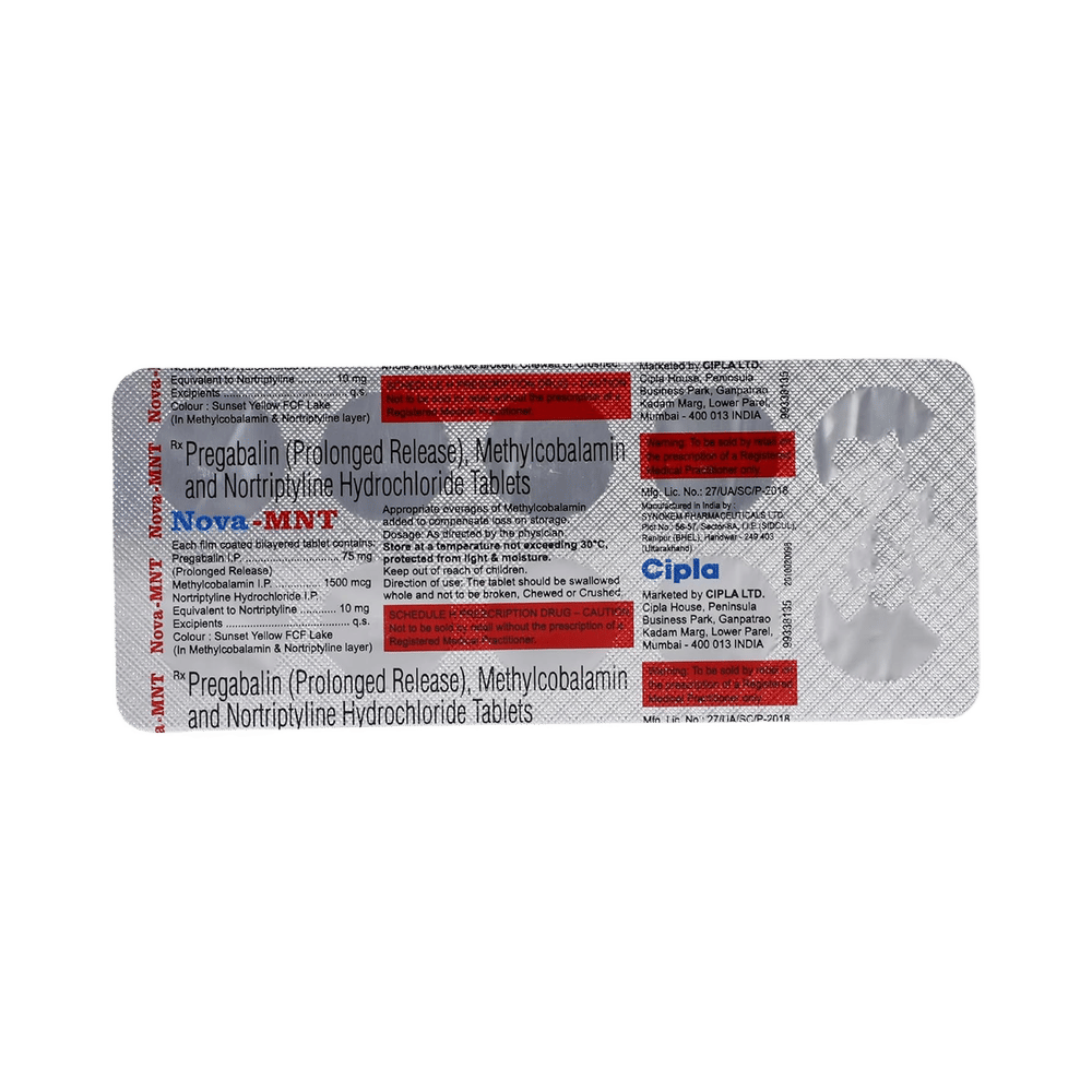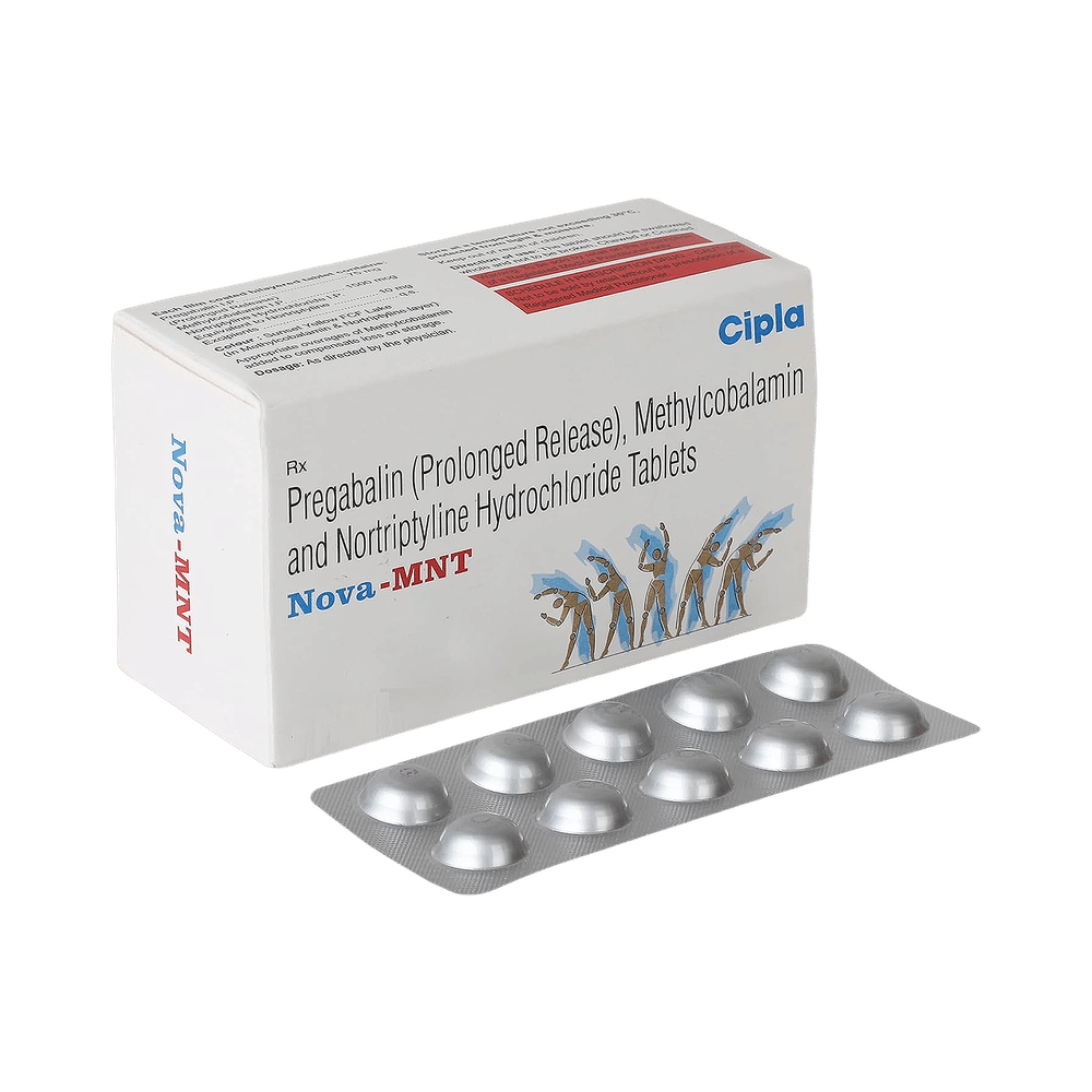 Nova-MNT Tablet PR is a combination of three medicines used to treat neuropathic pain. It works by decreasing pain by controlling calcium channel activity of the nerve cells. It also increases the level of chemical messengers in the brain that help in regulating the mood and protect nerve fibers. Nova-MNT Tablet PR can be taken with or without food. However, it is advised to take it at the same time each day as this helps to maintain a consistent level of medicine in the body. Take this medicine in the dose and duration advised by the doctor. If you miss a dose of this medicine, take it as soon as you remember. Finish the full course of the treatment even if you feel better. It is important not to stop taking this medicine suddenly as it may worsen your symptoms.Some common side effects of this medicine include constipation, weight gain, and dryness in mouth. It may cause dizziness and sleepiness, so do not drive or do anything that requires mental focus until you know how this medicine affects you. This medicine may cause weight gain and to control it, you should have a balanced diet and exercise regularly. You must inform your doctor if you develop any unusual changes in mood or behavior, new or worsening depression, or suicidal thoughts.Before taking this medicine let your doctor know if you suffer from kidney or liver disease. Your doctor should also know about all other medicines you are taking as many of these may make this medicine less effective or change the way it works. Inform your doctor if you are pregnant, planning pregnancy or breastfeeding.