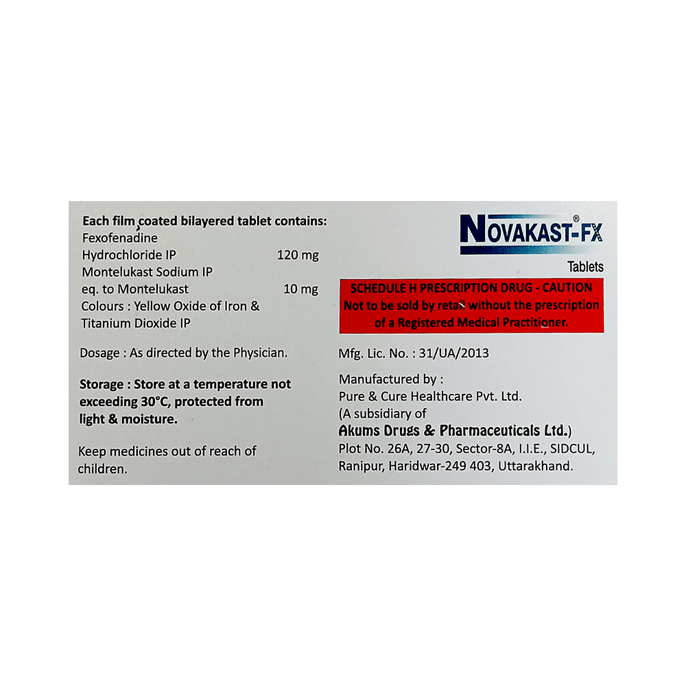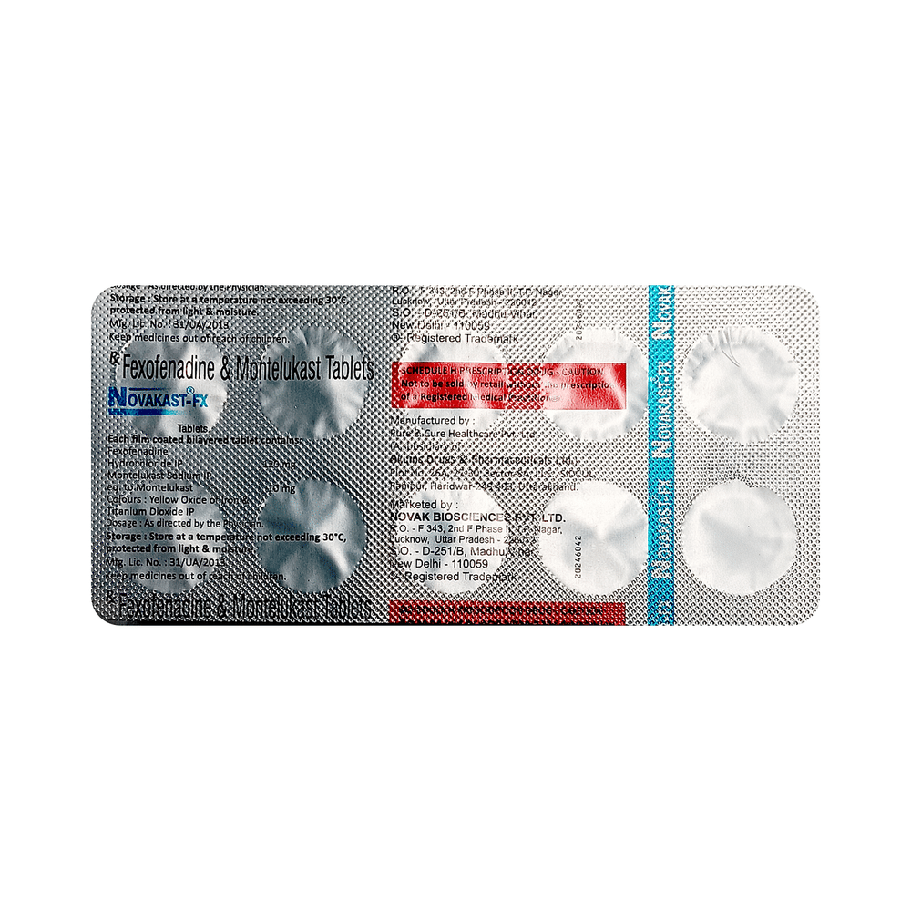 In Treatment of Sneezing and runny nose due to allergiesNovakast-FX Tablet is a combination medicine that provides relief from symptoms such as blocked or runny nose, sneezing and itchy or watery eyes. This will make it easier for you to go about your daily activities. It rarely has any serious side effects and you may only need to take it on days you have symptoms. If you are taking it to prevent getting symptoms you should use it regularly to get the most benefit.
