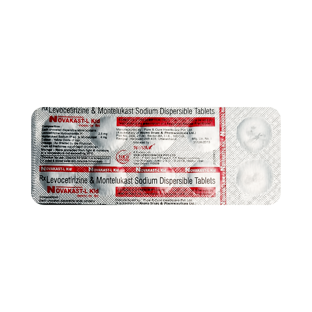Novakast-L Kid Tablet DT is commonly prescribed in children to treat symptoms of allergy such as runny nose, sneezing, itching, swelling, congestion, and watery eyes. It may also help in the treatment of asthma and skin allergies. Give this medicine to your child at a fixed time before or after food in the prescribed dose, time, and way. For asthma, prefer giving Novakast-L Kid Tablet DT in the evening or 2 hours before physical activity. For allergy, it is best to give it either in the morning or in the evening, depending upon the time of onset of symptoms. In case your child has both, prefer giving it in the evening. If your child vomits within 30 minutes of taking this medicine, give the same dose again, but skip it if it’s already time for the next dose.Your child may start to feel better after a few regular doses. However, you must still complete the prescribed dose to ensure maximum benefit. Moreover, stopping the medicine abruptly may worsen your child’s condition. This medicine may cause some minor and temporary side effects like vomiting, diarrhea, nausea, dizziness, dry mouth, rash, and headache. Usually, these episodes subside once your child’s body adapts to the medicine. However, in case these effects persist or start bothering your child, consult your child’s doctor without any delay.Let your child’s doctor know if your child is already taking any medicines. Also, narrate your child’s complete medical history, including any prior episodes of allergy, heart problem, blood disorder, vascular disorders, birth defects, airway obstruction, lung anomaly, skin disorder, liver impairment, and kidney malfunction. This information is critical for dose alterations and in planning your child’s overall treatment.