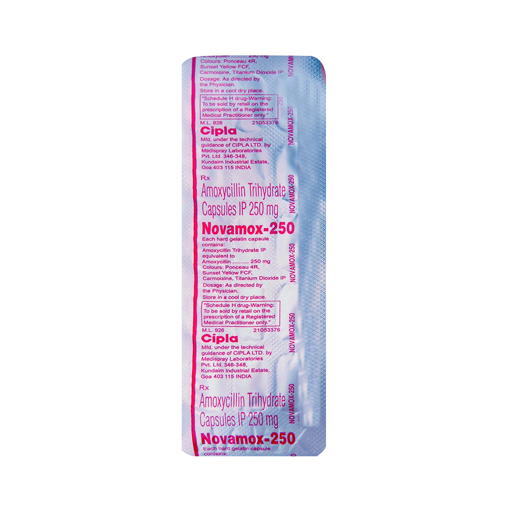 Novamox 250 Capsule is used to treat a variety of bacterial infections. It is effective in infections of the throat, ear, nasal sinuses, respiratory tract (e.g., pneumonia), urinary tract, skin and soft tissue, and typhoid fever. Additionally, Novamox 250 Capsule helps to eliminate a bacteria known as H. pylori in people with peptic ulcer disease. It is a broad-spectrum antibiotic that fights and stops the growth of many types of bacteria. This medicine is best taken with a meal to reduce the chance of a stomach upset. You should take it regularly at evenly spaced intervals as per the schedule prescribed by your doctor. Taking it at the same time every day will help you to remember to take it.Do not skip any doses and finish the full course of treatment even if you feel better. Stopping the medicine too early may lead to the infection returning or worsening. The total duration of treatment and precise dosage will be decided by your doctor, depending on the type of infection that you have and how well you respond to the medication.Before taking this medicine, inform your doctor if you are allergic to penicillin or any penicillin-type of medicine. Rash, vomiting, allergic reactions, nausea, and diarrhea may be seen as side effects in some patients. These are temporary and usually resolve quickly. Consult your doctor if any of these side effects persist or if your condition worsens. This medicine is generally regarded as safe to use during pregnancy if used under a doctor’s supervision.