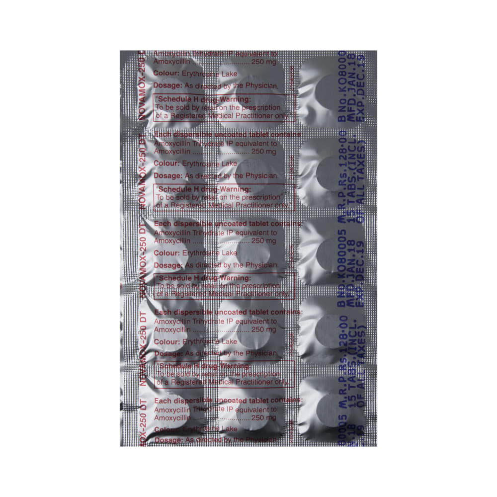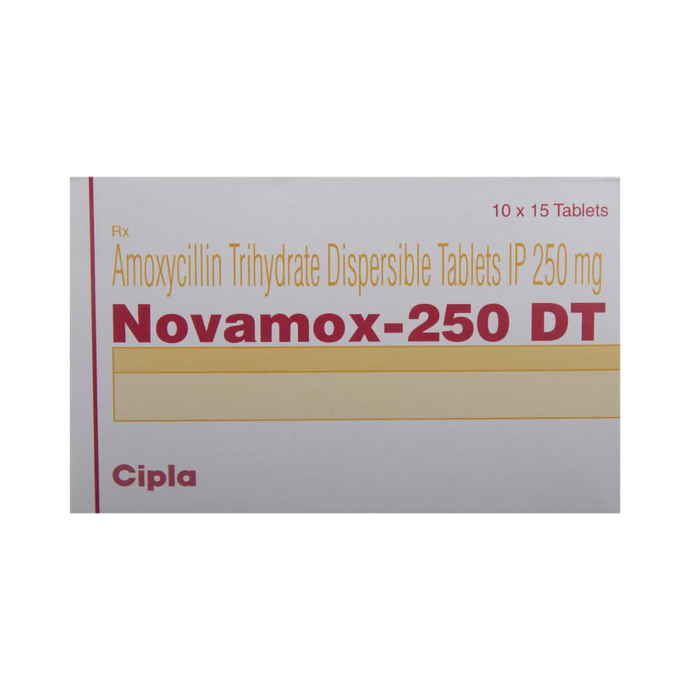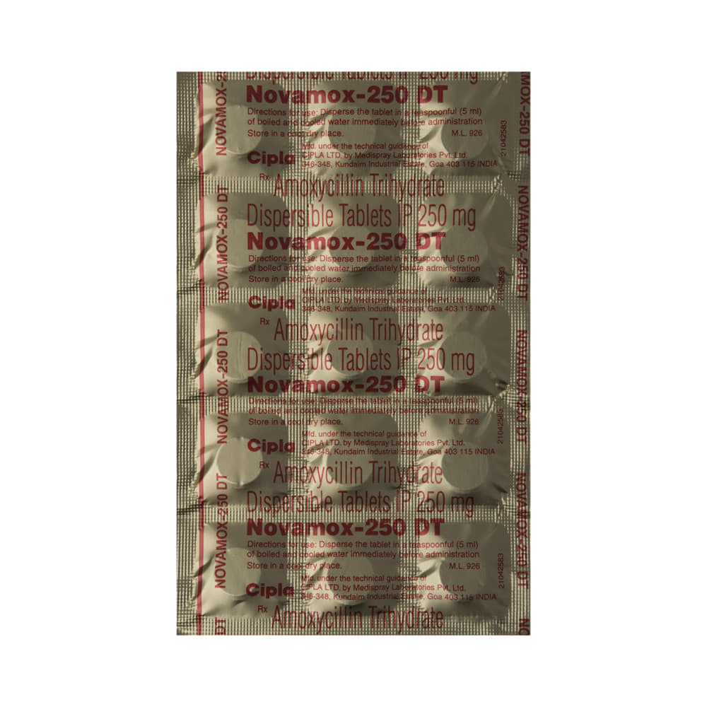 Novamox 250 DT Tablet is used to treat a variety of bacterial infections. It is effective in infections of the throat, ear, nasal sinuses, respiratory tract (e.g., pneumonia), urinary tract, skin and soft tissue, and typhoid fever. Additionally, Novamox 250 DT Tablet helps to eliminate a bacteria known as H. pylori in people with peptic ulcer disease. It is a broad-spectrum antibiotic that fights and stops the growth of many types of bacteria. This medicine is best taken with a meal to reduce the chance of a stomach upset. You should take it regularly at evenly spaced intervals as per the schedule prescribed by your doctor. Taking it at the same time every day will help you to remember to take it.Do not skip any doses and finish the full course of treatment even if you feel better. Stopping the medicine too early may lead to the infection returning or worsening. The total duration of treatment and precise dosage will be decided by your doctor, depending on the type of infection that you have and how well you respond to the medication.Before taking this medicine, inform your doctor if you are allergic to penicillin or any penicillin-type of medicine. Rash, vomiting, allergic reactions, nausea, and diarrhea may be seen as side effects in some patients. These are temporary and usually resolve quickly. Consult your doctor if any of these side effects persist or if your condition worsens. This medicine is generally regarded as safe to use during pregnancy if used under a doctor’s supervision.
