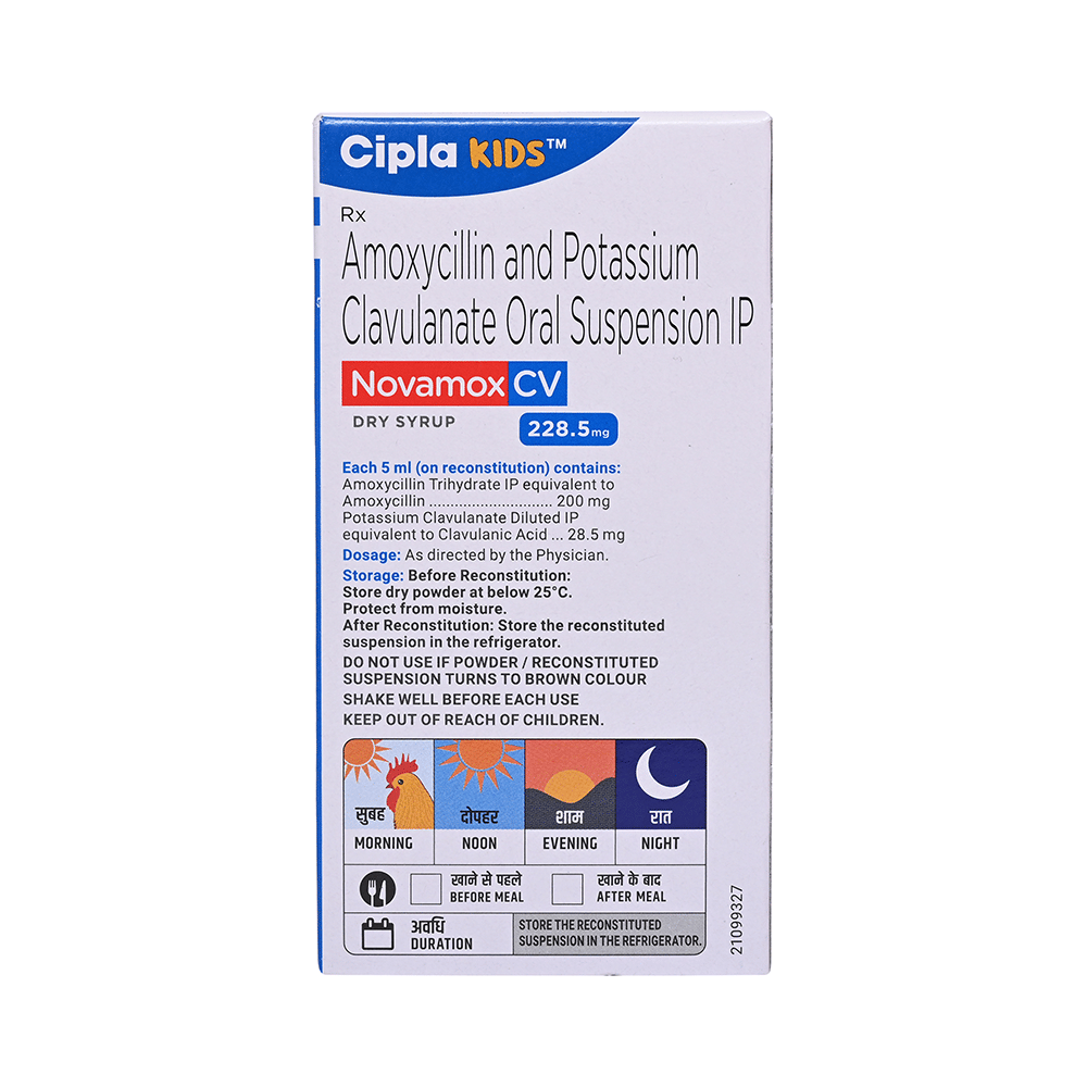 Novamox CV 228.5mg Dry Syrup is an antibiotic medicine that helps treat bacterial infections of the ear, nose, throat, chest, lungs, teeth, skin, and urinary tract. It is capable of killing bacteria that have become resistant to other therapies and thus also helps treat tuberculosis that is resistant to other treatments. You can give Novamox CV 228.5mg Dry Syrup to your child with or without food. It is better to give it with food as that helps increase absorption and decrease the risk of stomach upset. The doctor may prescribe giving it two to three times a day. Medicine dose depends on the severity of the infection, its type, and your child’s body weight and age. So, stick to the dose, time, and way prescribed. If your child vomits the medicine within 30 minutes of intake, let the child calm down and repeat the dose. Do not double dose if it's the time for the next dose.Novamox CV 228.5mg Dry Syrup may cause vomiting, diarrhea, nausea, abdominal pain, and allergy. These side effects should diminish on their own. But, in case they persist or start bothering your child, you must not delay speaking to your child’s doctor.Share your child’s entire medical history with the doctor, including any previous episode of allergy, heart problem, a blood disorder, birth defects, airway obstruction, lung anomaly, gastrointestinal problem, skin disorder, liver impairment, and kidney malfunction. This information will assist the doctor in making dose alterations and in planning your child’s overall treatment.