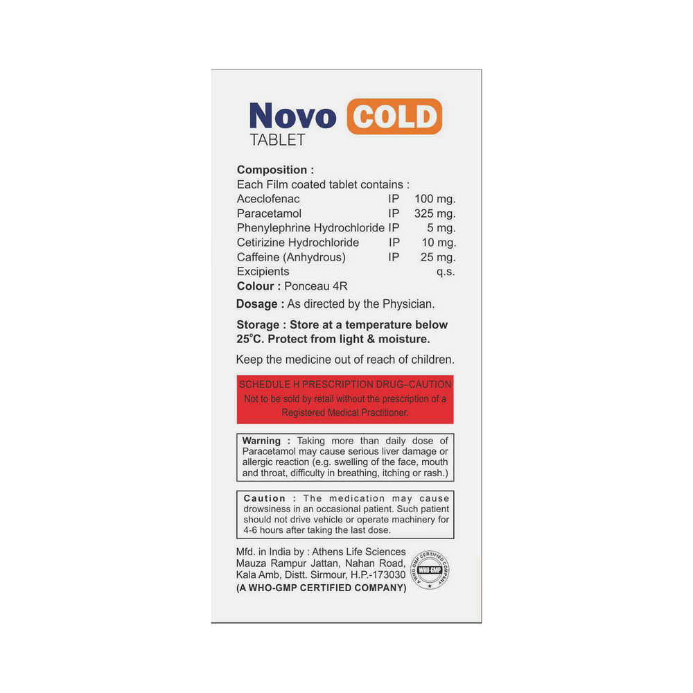 Novo Cold Tablet combines five medicines: Aceclofenac, Paracetamol, Cetirizine, Phenylephrine, and Caffeine, which help treat common cold symptoms. Aceclofenac is a non-steroidal anti-inflammatory drug (NSAID). It works by blocking the release of certain chemical messengers that cause pain and inflammation (redness and swelling). Paracetamol is an analgesic (pain reliever) and antipyretic (fever reducer). It works by blocking the release of certain chemical messengers that cause pain and fever. Cetirizine is an antihistamine medication. It treats allergy symptoms such as itching, swelling, and rashes by blocking the effects of a chemical messenger (histamine) in the body. Phenylephrine is a decongestant that narrows the small blood vessels, relieving congestion or stuffiness in the nose. Caffeine is a stimulant that decreases sleepiness caused by Cetirizine.