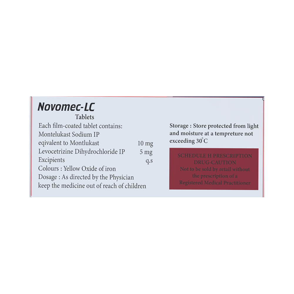 In Treatment of Allergic skin conditionsNovomec-LC Tablet is effective in treating allergic skin conditions with inflammation and itching. It reduces the actions of chemicals in the body that cause inflammation of the skin. When used correctly it is a safe and effective treatment. It reduces the redness, rash, pain or itchiness caused by your skin’s reaction to an irritant. It thus improves your self-esteem and confidence as your appearance changes. Keep taking it for as long as it is prescribed to get the full benefits.In Treatment of Sneezing and runny nose due to allergiesNovomec-LC Tablet is a combination medicine that provides relief from symptoms such as blocked or runny nose, sneezing and itchy or watery eyes. This will make it easier for you to go about your daily activities. It rarely has any serious side effects and you may only need to take it on days you have symptoms. If you are taking it to prevent getting symptoms you should use it regularly to get the most benefit.In Treatment of Hay feverHay fever, also called allergic rhinitis, causes cold-like signs and symptoms, such as a runny nose, itchy eyes, congestion, sneezing and sinus pressure. The only difference is that in hay fever, these symptoms are not produced due to a virus but are simply allergic responses of our body to allergens (allergy causing agents such as pollen). Novomec-LC Tablet is used to provide relief from these symptoms of hay fever. It works by blocking the release of the chemical substance responsible for producing such allergy symptoms. Novomec-LC Tablet is a safe medicine which helps treat hay fever and makes us feel at ease.show moreshow less