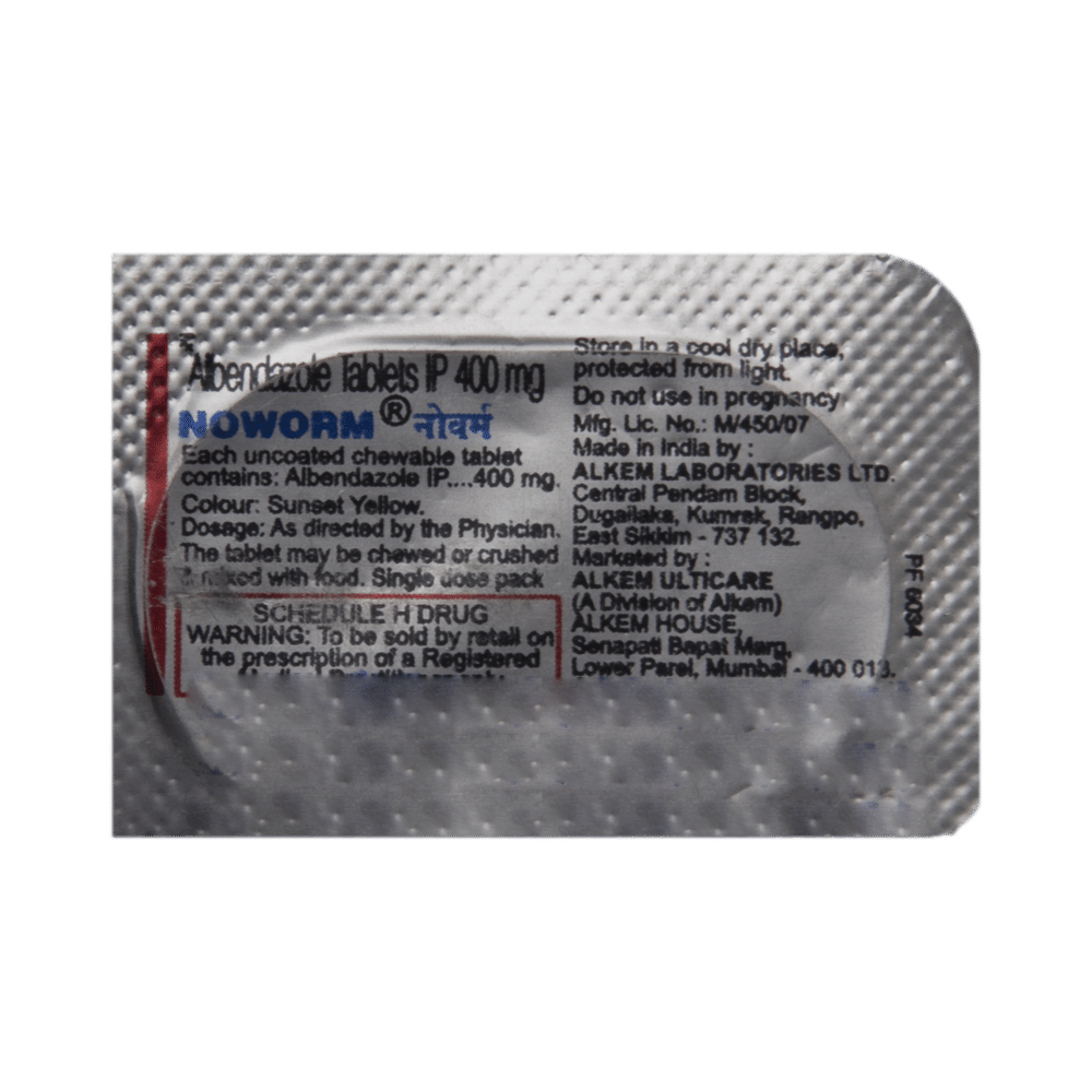 Noworm Chewable Tablet is an anthelmintic (anti-worm) medicine used to treat various parasitic infections. It is commonly prescribed for intestinal worm infections such as roundworms, hookworms, whipworms, and pinworms. It works by killing the worms that cause infections and stops the infection from spreading. Noworm Chewable Tablet should be taken with food. Follow all your doctor’s advice on the dose and duration for best results. Avoid skipping any doses and finish the full course of treatment even if you feel better.Some people may experience abnormal liver function tests, abdominal pain, nausea/vomiting, reversible alopecia, headache, dizziness/vertigo, and fever as the side effects of this medicine. Please consult your doctor if these side effects persist for a longer duration. You may be monitored with blood tests and liver function tests throughout your treatment.Before taking Noworm Chewable Tablet, inform your doctor if you have liver disease, a history of bone marrow suppression, or any known allergies to the medication. Advise females to use an effective method of contraception during treatment with Noworm Chewable Tablet. Pregnant and breastfeeding mothers should consult their doctor before use. Regular blood tests and liver function monitoring may be required during prolonged use.