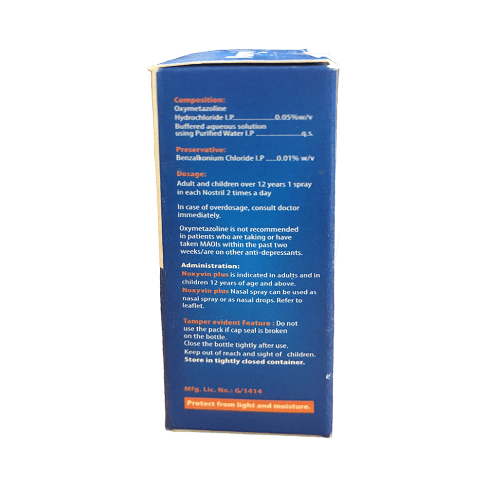 Noxyvin Plus Nasal Solution is a medicine used to treat nasal congestion (blocked nose) caused by the common cold or flu, hay fever and other allergies. It narrows the blood vessels in your nose to relieve nasal congestion and blockage. Noxyvin Plus Nasal Solution should be used as you have been advised by your doctor. Normally you should blow your nose gently before using it, keep one nostril closed while applying the medicine into the other, and then sniff hard to make sure it reaches deep into the nose. Then repeat the same for the other nostril. It provides relief very quickly and can last for several hours. It provides only temporary relief but do not use it more often or for longer than recommended. If you use this medicine too often or for too long, it may worsen your symptoms rather than improve them.The most common side effects are nose irritation and dryness of the mouth or throat. These are usually mild but if they bother you or do not go away, your doctor may be able to suggest ways of preventing or reducing them.It is generally a safe medicine but, before taking it, talk to your doctor about any health problems you have such as heart problems or high blood pressure (hypertension) or overactive thyroid gland or glaucoma (increased pressure in the eye), or prostate enlargement. Let your doctor know about any other medicines you are taking to make sure you are safe. Ask your doctor for advice before using this medicine if you are pregnant or breastfeeding.