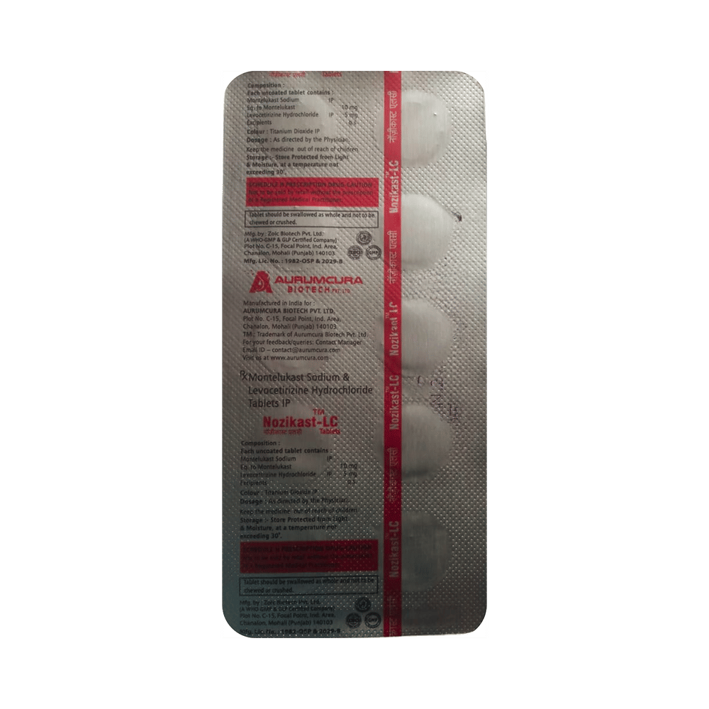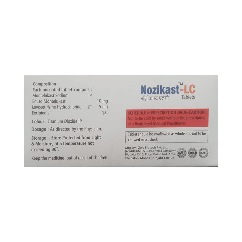 In Treatment of Allergic skin conditionsNozikast-LC Tablet is effective in treating allergic skin conditions with inflammation and itching. It reduces the actions of chemicals in the body that cause inflammation of the skin. When used correctly it is a safe and effective treatment. It reduces the redness, rash, pain or itchiness caused by your skin’s reaction to an irritant. It thus improves your self-esteem and confidence as your appearance changes. Keep taking it for as long as it is prescribed to get the full benefits.In Treatment of Sneezing and runny nose due to allergiesNozikast-LC Tablet is a combination medicine that provides relief from symptoms such as blocked or runny nose, sneezing and itchy or watery eyes. This will make it easier for you to go about your daily activities. It rarely has any serious side effects and you may only need to take it on days you have symptoms. If you are taking it to prevent getting symptoms you should use it regularly to get the most benefit.In Treatment of Hay feverHay fever, also called allergic rhinitis, causes cold-like signs and symptoms, such as a runny nose, itchy eyes, congestion, sneezing and sinus pressure. The only difference is that in hay fever, these symptoms are not produced due to a virus but are simply allergic responses of our body to allergens (allergy causing agents such as pollen). Nozikast-LC Tablet is used to provide relief from these symptoms of hay fever. It works by blocking the release of the chemical substance responsible for producing such allergy symptoms. Nozikast-LC Tablet is a safe medicine which helps treat hay fever and makes us feel at ease.show moreshow less