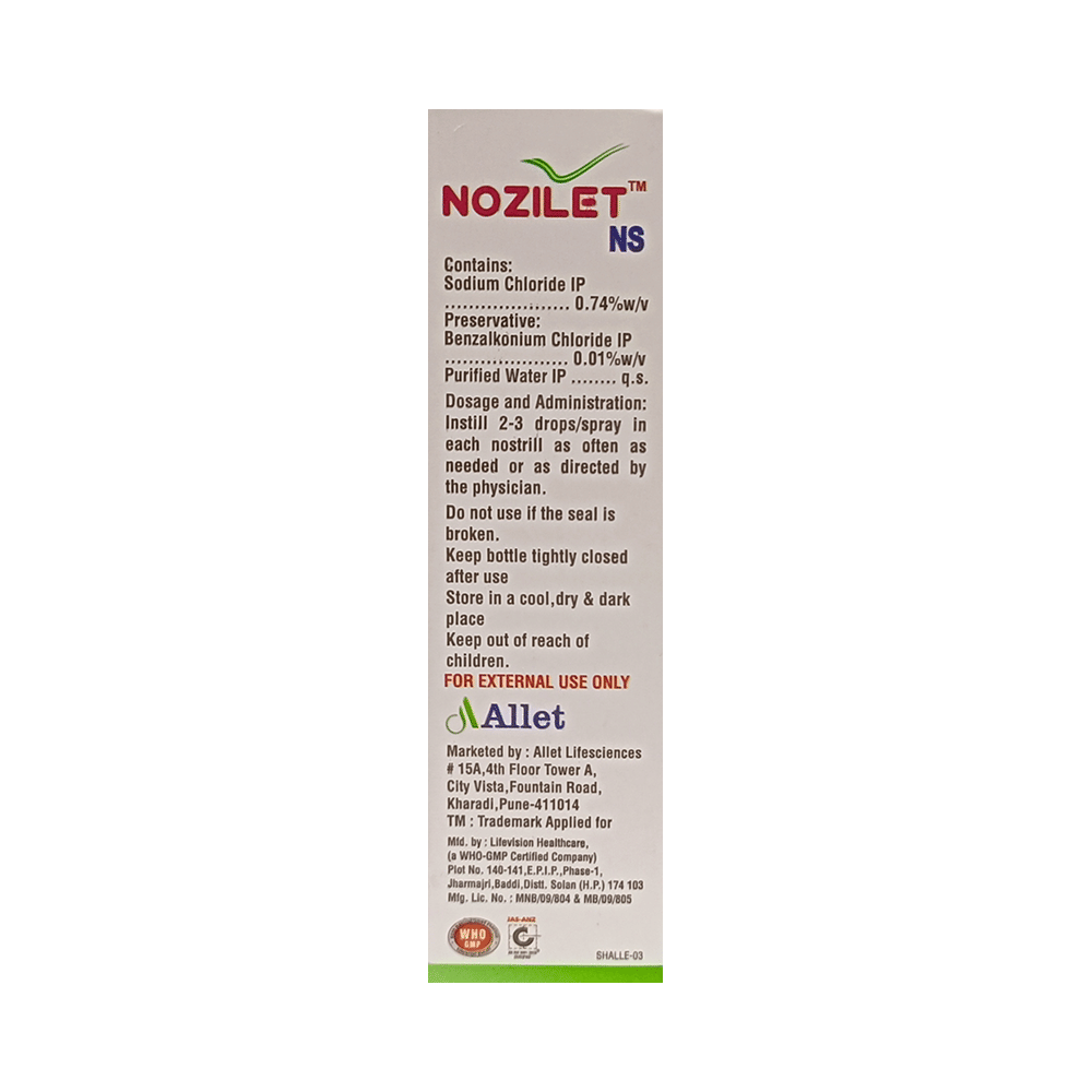 Nozilet NS Nasal Solution comprises of purified salt solution. It is used to treat nasal congestion (blocked nose). It moisturizes and loosens the mucus inside of the nose and provides rapid relief from nasal congestion. Nozilet NS Nasal Solution works by moisturizing the inner surface of the nose. It helps in providing relief from stuffy nose due to common cold or allergies. This medicine is for external use only. You should use it in a dose and duration as advised by your doctor.Before using this medicine, check the label. You have to tilt your head as far back as possible. Hold the dropper close to the nose. Make sure that you do not touch the nozzle. Squeeze the dropper gently so that the medicine gets placed in the nose. After few minutes, you can bend your head forward.It is generally safe with little or no side effects. However, it might cause nasal irritation at the time of application. Before using this medicine, inform your doctor if you are on any medication or are allergic to this medication. Also, inform your doctor if you are pregnant or breastfeeding. Please consult your doctor, if you miss any dose.