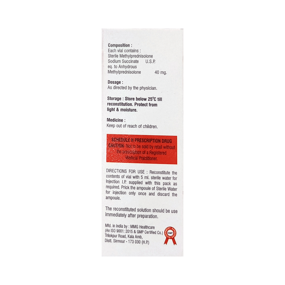 In Treatment of Allergic conditionsNspred 40 Injection is used to treat different inflammatory and allergic conditions including arthritis, lupus, psoriasis, ulcerative colitis which affect the skin, blood, eyes, lungs, stomach, and nervous system. It works by lowering your immune system’s response to these conditions thereby reducing symptoms such as swelling, pain, itching and other allergic-type reactions.This medicine is given orally (by mouth). You should always take it as it has been prescribed for you. Do not stop taking it without your doctor’s advice. This can cause unpleasant withdrawal symptoms. Because this medicine weakens your immune system, you should avoid being near people who are ill or have infections.In Treatment of Systemic lupus erythematosus (SLE)Systemic lupus erythematosus (SLE) is an autoimmune disease. In this disease, the immune system of the body mistakenly attacks healthy tissue. It can affect the skin, joints, kidneys, brain, and other organs. Nspred 40 Injection prevents the release of substances in the body that cause inflammation. It lowers your immune system’s response and reduces symptoms such as swelling, pain, itching and other allergic-type reactions.In Treatment of Skin disordersNspred 40 Injection prevents the release of substances in the body that cause inflammation. It can be used to treat different inflammatory and allergic conditions of the skin such as eczema and psoriasis. It works by lowering your immune system’s response to these conditions thereby relieving symptoms such as swelling, pain, itching and other allergic-type reactions.In Treatment of Eye disordersNspred 40 Injection helps relieve symptoms of eye infections such as redness, swelling, itching and watering of eyes. This medicine works by decreasing the production of certain chemicals that cause inflammation of the eyes. This will make it easier for you to go about your daily activities. Use it as prescribed to get the most benefit. If you see no improvement even after a week, talk to your doctor.In Treatment of Rheumatic disorderRheumatic disorder is an autoimmune condition where your body’s immune system (which usually fights bacteria and viruses) attacks your body’s own cells. Nspred 40 Injection stops that from happening and can relieve the symptoms of this condition such as pain, swelling, and stiffness in your joints. It can also slow down joint damage, reduce disability, and enable you to be as active for as long as possible. It can take several weeks or months to notice the effect of the medicine. You should continue taking it until your doctor says it is okay to stop using the medicine.show moreshow less