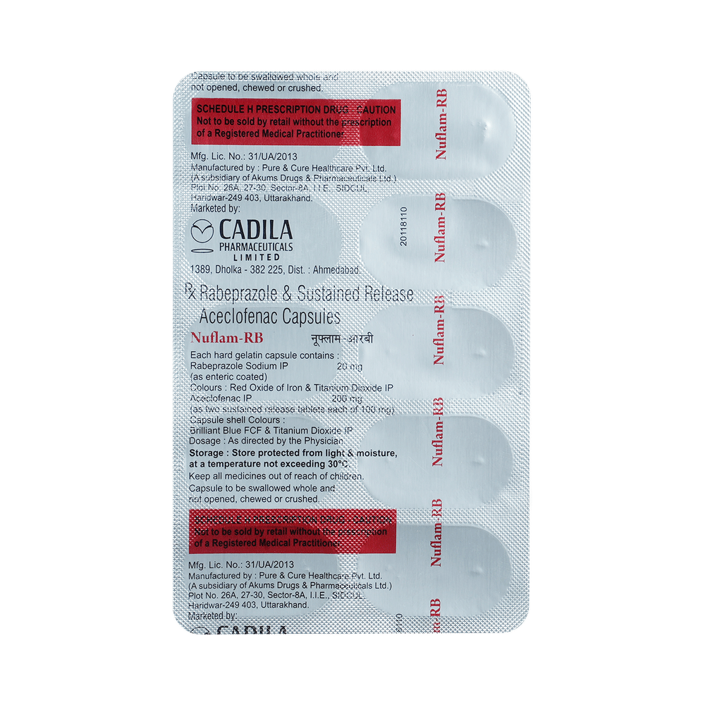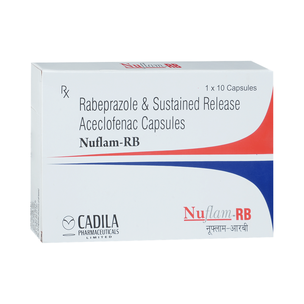 Nuflam-RB Capsule SR is a combination of two medicines: Aceclofenac and Rabeprazole, which relieves pain. Aceclofenac is a non-steroidal anti-inflammatory drug (NSAID) which works by blocking the release of certain chemical messengers that cause pain and inflammation (redness and swelling). Rabeprazole is a proton-pump inhibitor which prevents damage to the stomach lining caused by Aceclofenac.