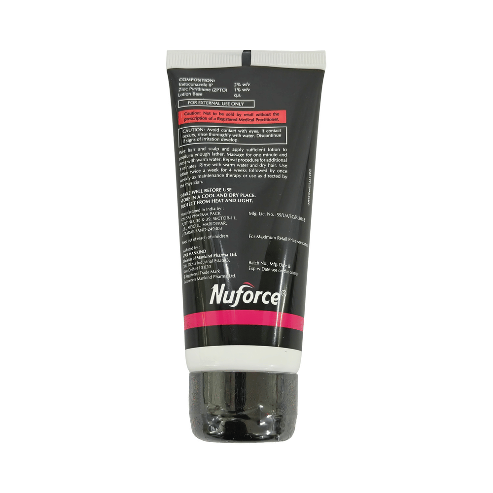 Nuforce Anti Dandruff Lotion is a combination of two antifungal medicines: Ketoconazole and Zinc pyrithione. It works by destroying the cell membrane of fungi that cause dandruff. Ketoconazole works by breaking down the cell membrane of fungi, effectively killing them, while zinc pyrithione controls fungal growth and reduces irritation, redness, and flaking. Together, they combat fungal infections, soothe the affected area, and prevent recurrence, promoting healthier skin and scalp. Use as directed for best results.