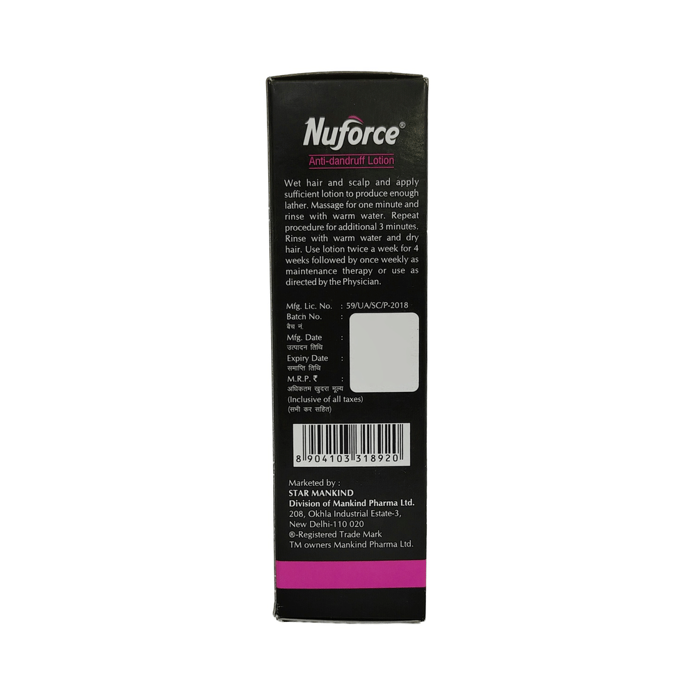 In Treatment of DandruffNuforce Anti Dandruff Lotion is used to control dandruff and gives relief from scaly, flaky, and itchy scalp. It stops the growth of fungus that causes dandruff. Regular use of Nuforce Anti Dandruff Lotion protects your scalp and prevents dandruff. Gently massage your scalp with Nuforce Anti Dandruff Lotion to loosen flakes. Make sure you complete the full course of treatment. This will ensure that the infection is completely cured and prevent it from returning.In Treatment of Fungal skin infectionsNuforce Anti Dandruff Lotion is used to treat and control fungal infections like athlete’s foot (infection between toes), jock itch (infection of the groin area), ringworm, and other fungal skin infections (candidiasis). Keep using the Nuforce Anti Dandruff Lotion for as long as it is prescribed.show moreshow less