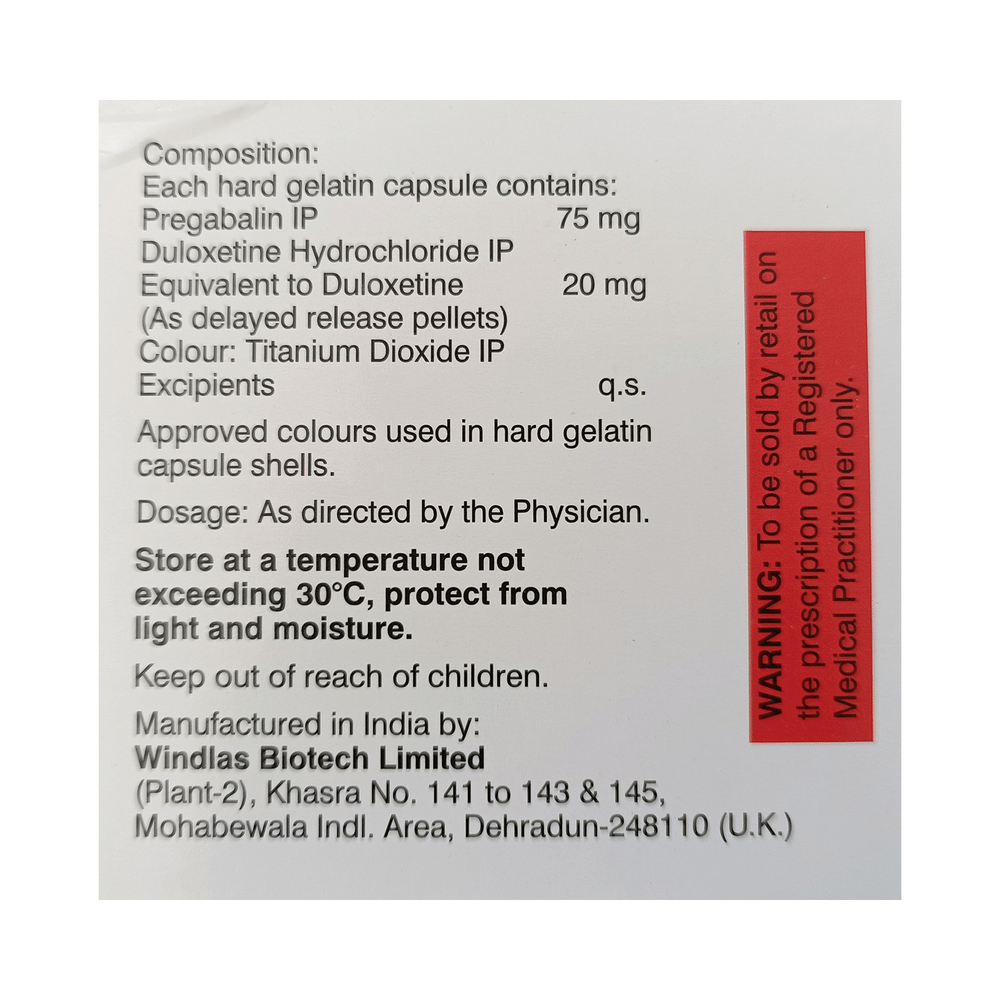 Salt Composition: Pregabalin (75mg) + Duloxetine (20mg)