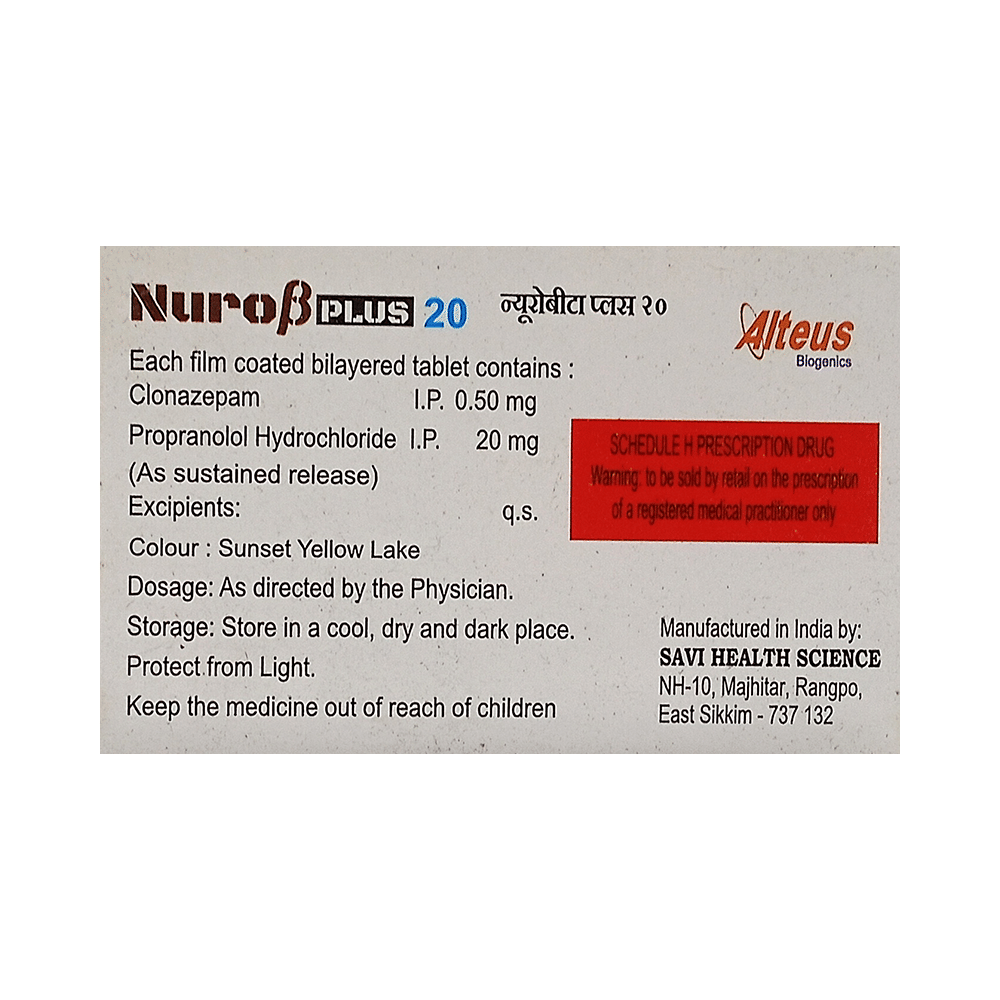 Nuro Beta Plus 20 Tablet SR is a prescription medicine used to treat anxiety disorder. It calms the brain by decreasing the abnormal and excessive activity of the nerve cells. It blocks the action of certain chemical messengers on the heart and blood vessels. This reduces heart rate and blood pressure. Nuro Beta Plus 20 Tablet SR should be taken on an empty stomach. However, it is advised to take it at the same time each day as this helps to maintain a consistent level of medicine in the body. Take this medicine in the dose and duration advised by your doctor as it has high habit-forming potential. If you miss a dose of this medicine, take it as soon as you remember. Finish the full course of treatment even if you feel better. It is important not to stop taking this medicine suddenly as it may cause withdrawal symptoms. Avoid consuming alcohol while taking this medicine as this may reduce its effectiveness.Some common side effects of this medicine include confusion, memory impairment, slow heart rate, tiredness, and nightmare. It may also cause dizziness and sleepiness. So, do not drive or do anything that requires mental focus until you know how this medicine affects you. It is important to inform your doctor if you develop any unusual changes in mood or depression as this medicine may cause suicidal thoughts.Take caution while taking medicine if you are suffering from liver disease. Your doctor should also know about all other medicines you are taking as many of these may make this medicine less effective or change the way it works. Inform your doctor if you are pregnant, planning pregnancy, or breastfeeding.