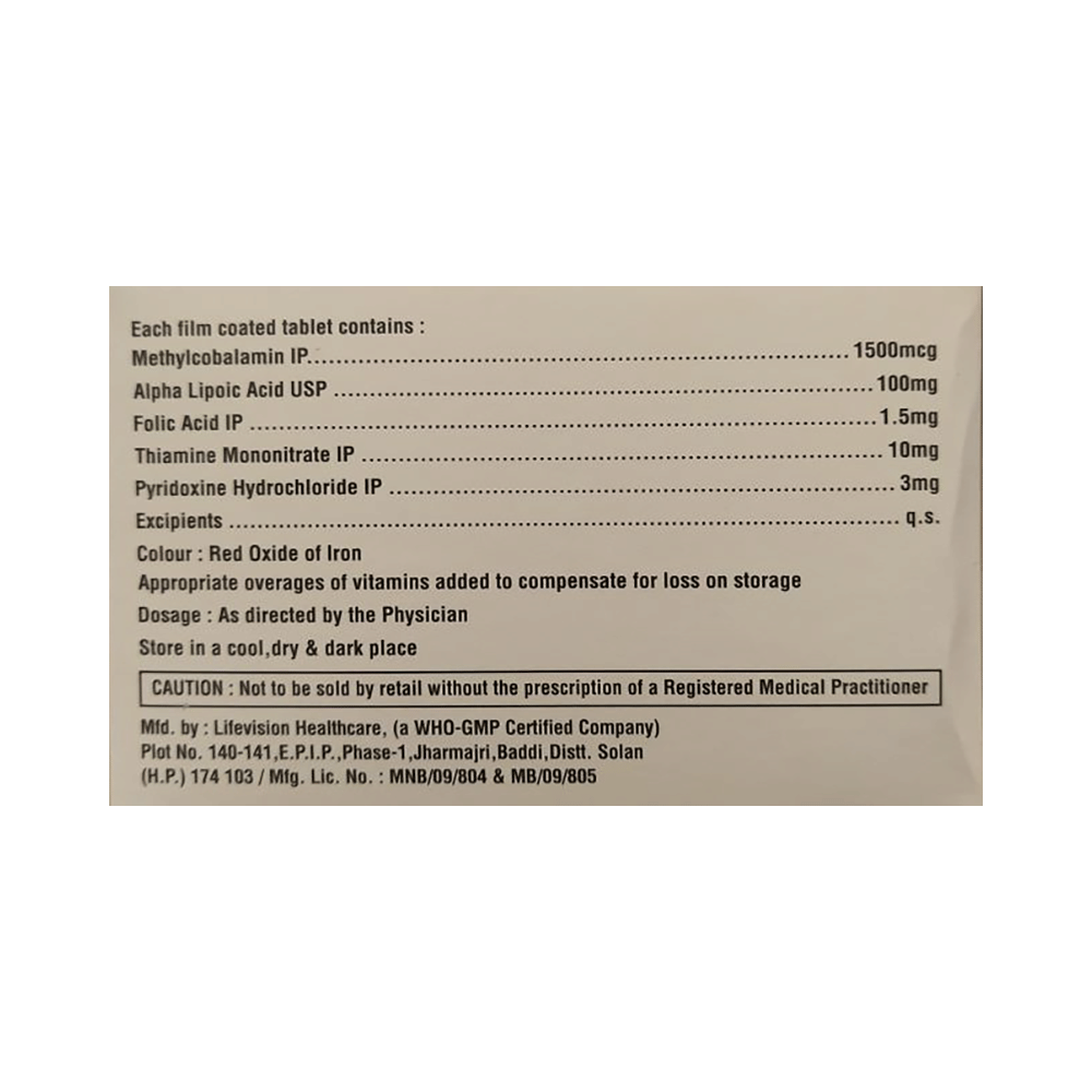 Salt Composition: Methylcobalamin (1500mcg) + Alpha Lipoic Acid (100mg) + Thiamine mononitrate (10mg) + Pyridoxine Hydrochloride (3mg) + Folic Acid (1.5mg)