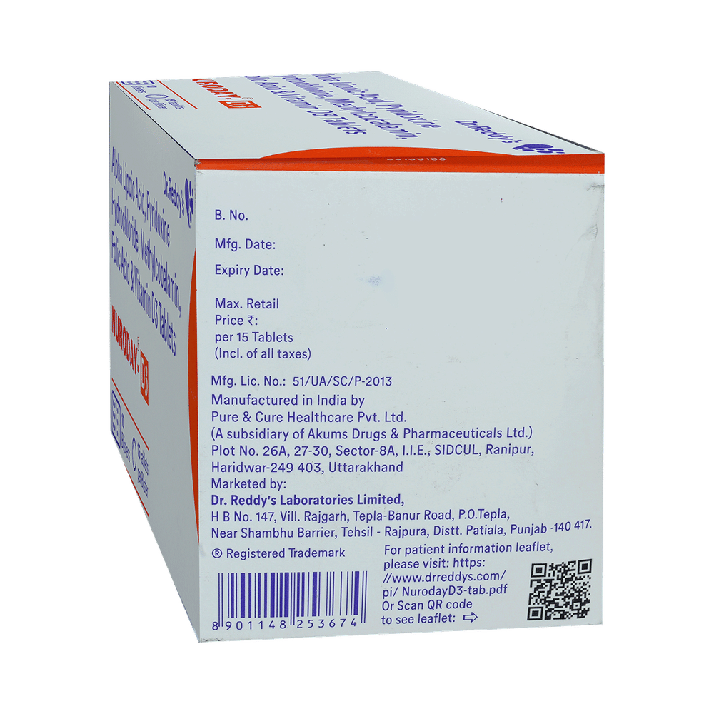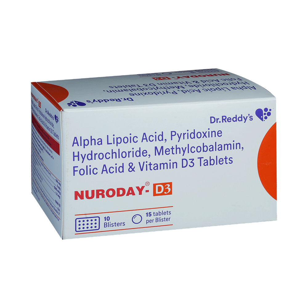 Nuroday-D3 Tablet is a prescription medicine which has a combination of medicine that is used in the treatment of nutritional deficiencies. It contains nutritional supplements that are important for the proper growth and development of the body. Nuroday-D3 Tablet may be taken with or without food. It should be used in the dose and duration as prescribed by your doctor. It is advised to take this medicine at a fixed time.This medicine should not be taken more than the recommended dose. It is usually a safe medicine, however some people may experience diarrhea, nausea, vomiting, and constipation. If you experience any of these side effects which do not resolve on their own or get worse, let your doctor know.Before taking this medicine, tell your doctor if you have any other health conditions. Inform your doctor if you are taking any other medicines or if you are pregnant or breastfeeding. It is advised to avoid alcohol intake while taking this medicine.
