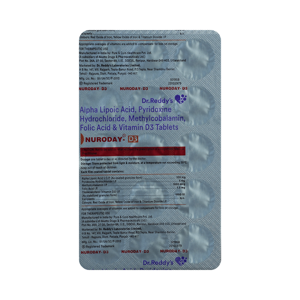 Nuroday-D3 Tablet is a combination of five nutritional supplements. Methylcobalamin is an active form of Vitamin B 12. This helps in proper cell growth and development, helps in protein synthesis and production of blood cells (red and white blood cells). Alpha Lipoic Acid is an antioxidant that repairs cell damage and restores vitamin level in the body, it also improves the functions of the nerves. Vitamin B6 (Pyridoxine) and Vitamin D3 are vitamin nutritional supplements that regulate essential metabolic functions in the body for proper growth and development. Folic Acid is also known as folate or vitamin B9. It helps in producing blood (hemoglobin) in the body. This is how it works in the treatment of nutritional deficiencies.