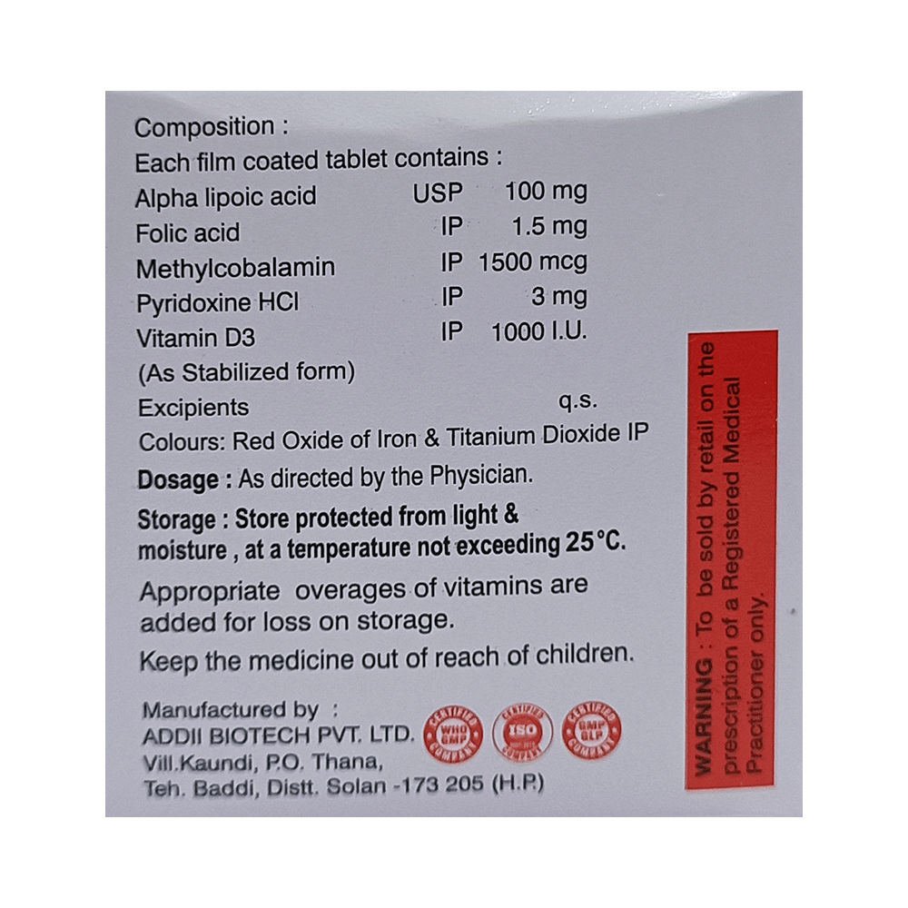 Salt Composition: Methylcobalamin (1500mcg) + Alpha Lipoic Acid (100mg) + Vitamin B6 (Pyridoxine) (3mg) + Folic Acid (1.5mg) + Vitamin D3 (1000IU)
