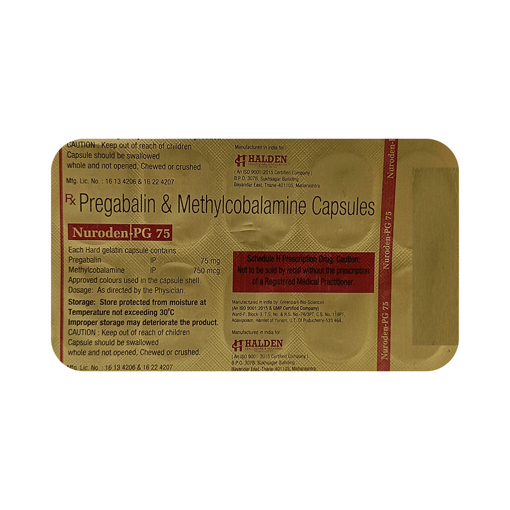 Nuroden-PG 75 Capsule is a prescription medicine used for the treatment of neuropathic pain. It decreases pain by modulating the calcium channel activity of the nerve cells. This medicine also protects nerve fibers and heals damaged nerve cells. Nuroden-PG 75 Capsule may be taken with or without food, preferably at bedtime. It is advised to take it at the same time each day as this helps to maintain a consistent level of medicine in the body. Take this medicine in the dose and duration advised by your doctor. If you miss a dose of this medicine, take it as soon as you remember. Finish the full course of treatment even if you feel better. This medication must not be stopped suddenly without talking to the doctor.Some common side effects of this medicine include nausea, vomiting, diarrhea, constipation, blurred vision, dizziness, and sleepiness. Do not drive or do anything that requires mental focus until you know how this medicine affects you. The side effects are mild and usually improve with time. It may also cause weight gain in some people. Exercise regularly and have a balanced diet to keep your weight in check. Inform your doctor if you develop any unusual changes in mood or behavior, new or worsening depression, or suicidal thoughts.Your doctor should also know about all other medicines you are taking, as many of these may make this medicine less effective or change the way it works. Inform your doctor if you are pregnant, planning pregnancy, or breastfeeding to make sure it is safe for you and the developing baby.