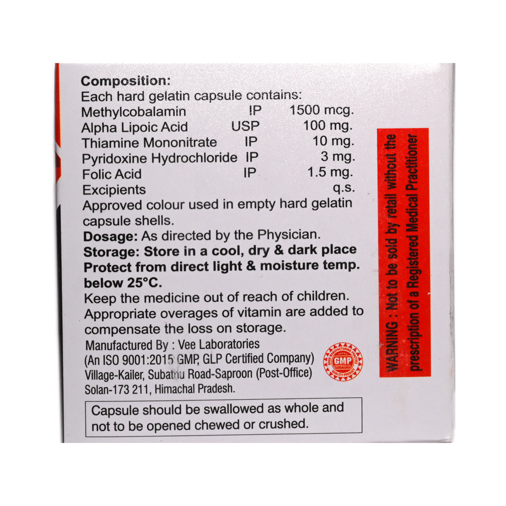 Salt Composition: Methylcobalamin (1500mcg) + Alpha Lipoic Acid (100mg) + Thiamine mononitrate (10mg) + Pyridoxine Hydrochloride (3mg) + Folic Acid (1.5mg)