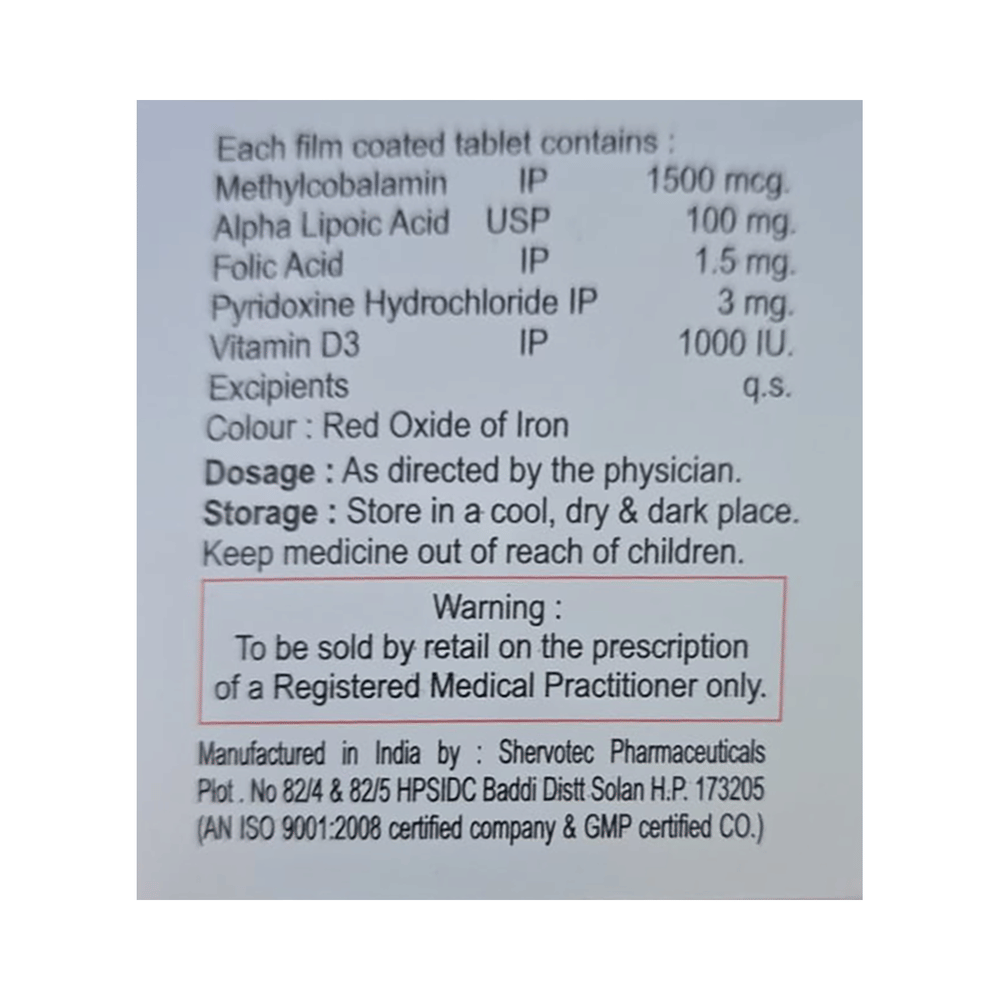 Salt Composition: Methylcobalamin (1500mcg) + Alpha Lipoic Acid (100mg) + Vitamin B6 (Pyridoxine) (3mg) + Folic Acid (1.5mg) + Vitamin D3 (1000IU)