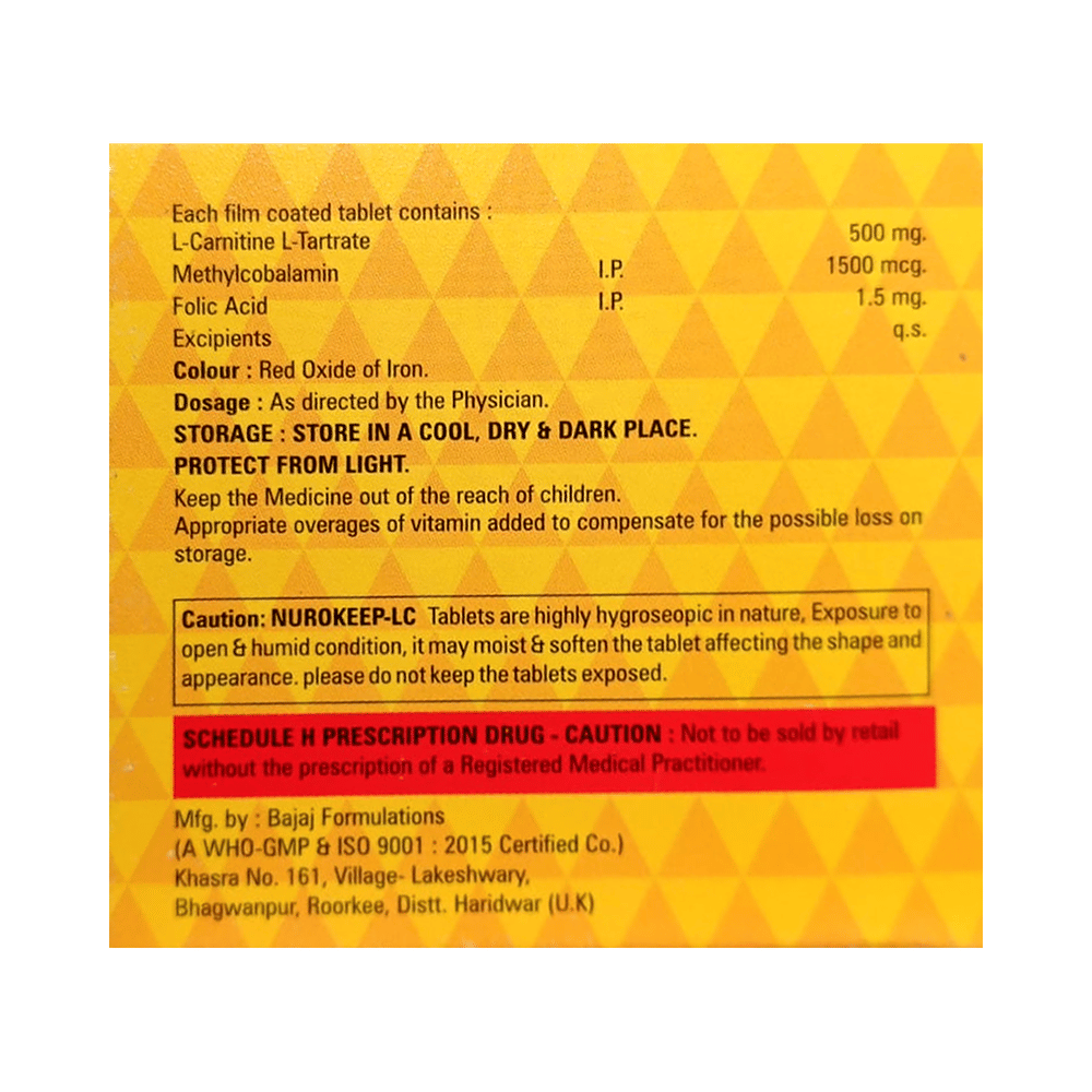 Nurokeep LC Tablet is a combination of vitamin B9, B12, L-carnitine L-tartrate. Folic acid is essential for production of red blood cells. It prevents and treats folate deficiency and anemia. When taken by pregnant women, Folic acid prevents miscarriage, preterm labor, and neural tube defects in infants. Levo-carnitine L-tartrate helps turn the fats present in ingested food into energy. It decreases insulin resistance and oxidative stress and improves immune function. Methylcobalamin corrects vitamin B12 deficiency thereby helping in treating certain anemias and nerve problems.