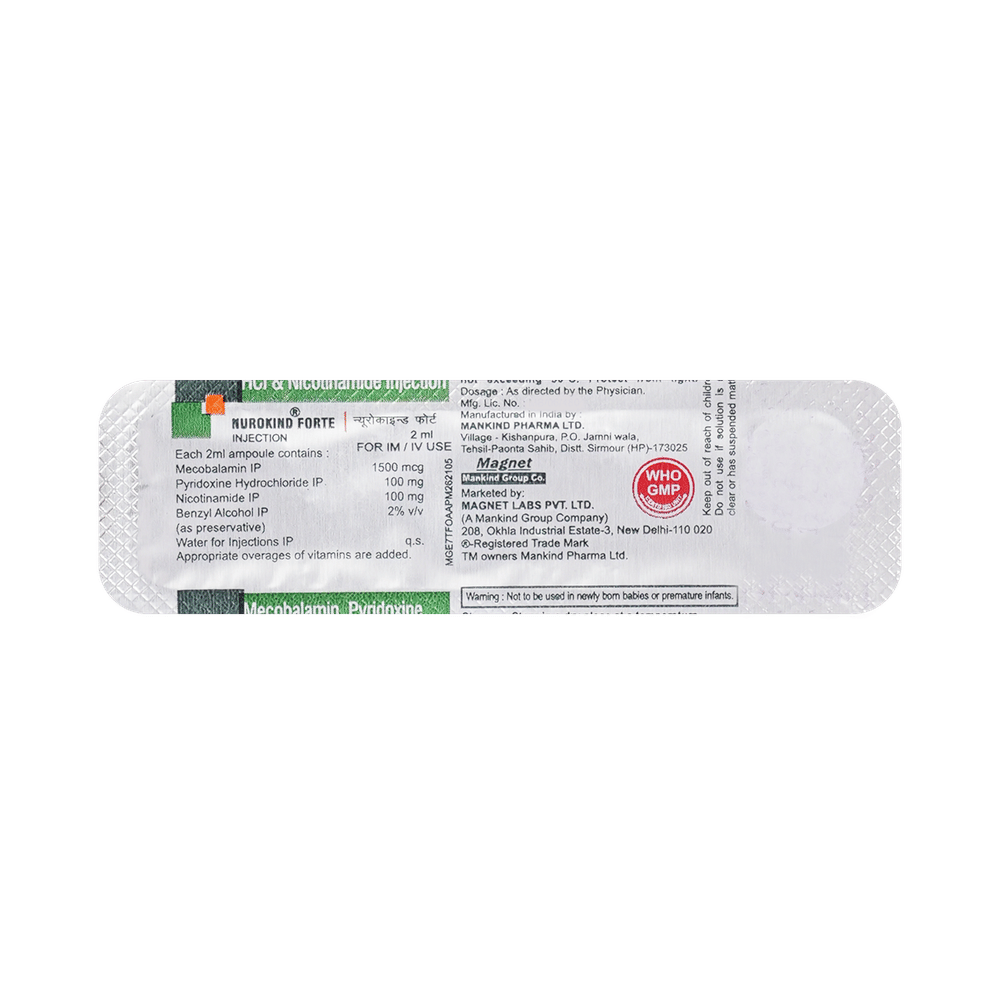 Nurokind Forte 1500mcg/100mg/100mg Injection is a combination of three nutritional supplements: Methylcobalamin, Vitamin B6 (Pyridoxine) and Nicotinamide. Together, these replenish the body's stores of important nutrients.