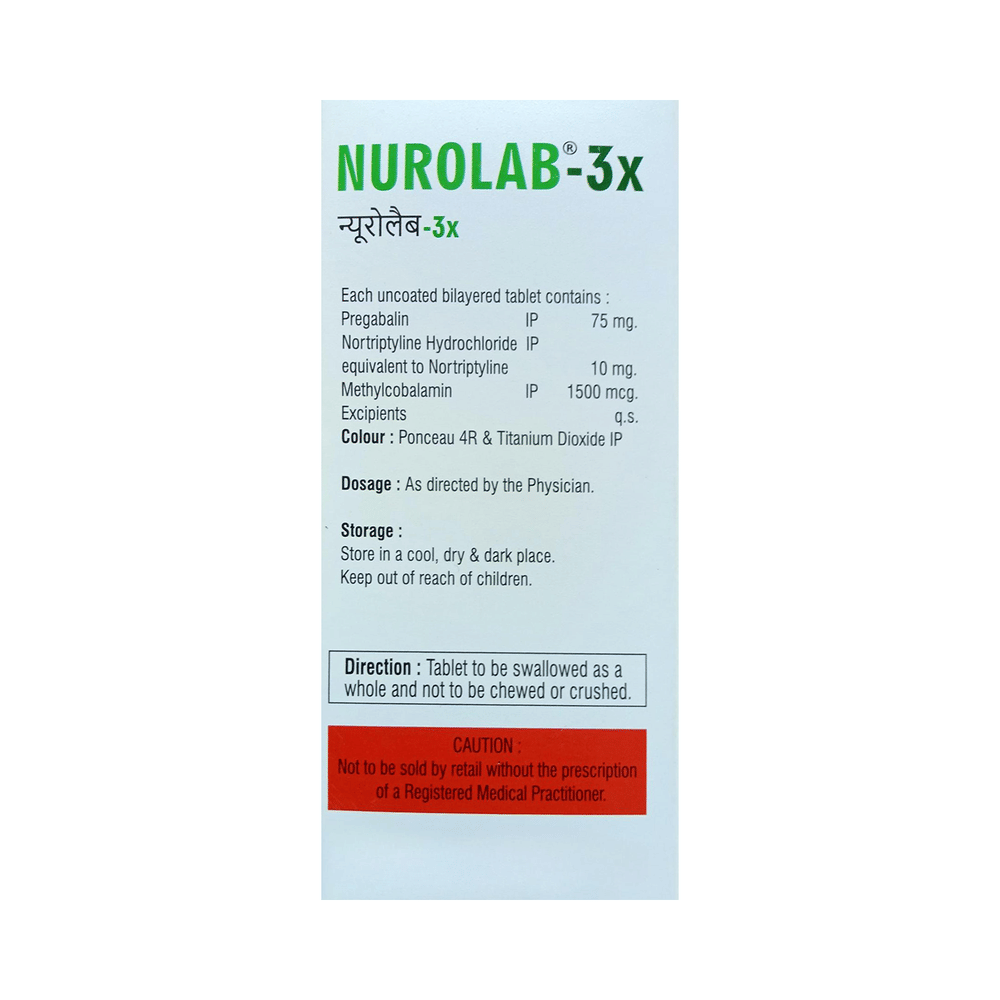 Nurolab 3X Tablet is a combination of three medicines: Pregabalin, Nortriptyline and Methylcobalamin. Pregabalin is an alpha 2 delta ligand which decreases pain by modulating calcium channel activity of the nerve cells. Nortriptyline is a tricyclic antidepressant which increases the levels of chemical messengers (serotonin and noradrenaline) that stop the movement of pain signals in the brain. Methylcobalamin is a form of vitamin B which helps in the production of myelin, a substance that protects nerve fibers and rejuvenates damaged nerve cells. Together, they relieve neuropathic pain (pain from damaged nerves).