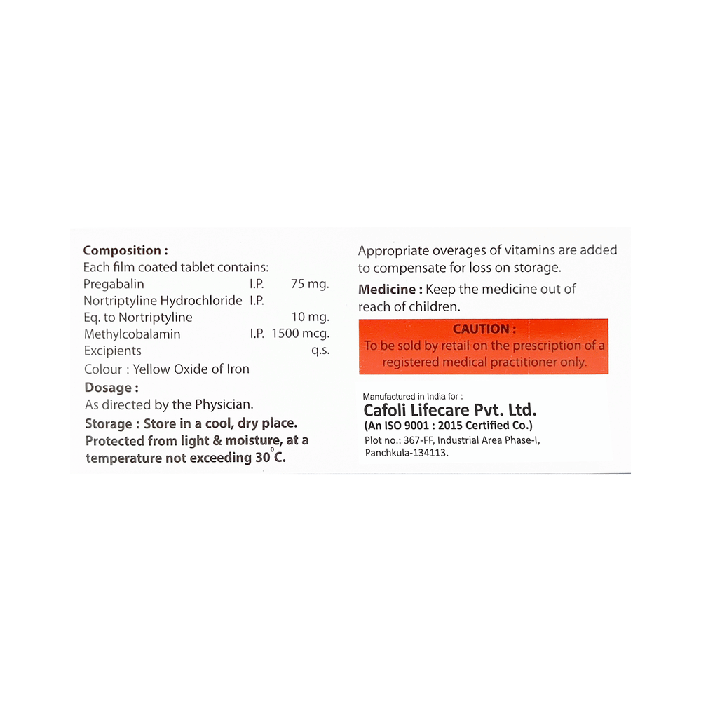Salt Composition: Pregabalin (75mg) + Nortriptyline (10mg) + Methylcobalamin (1500mcg)