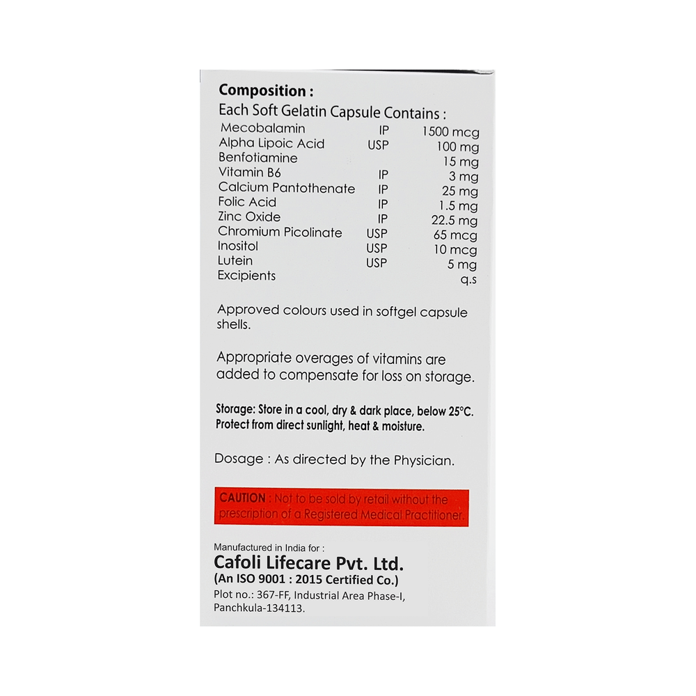 Salt Composition: Methylcobalamin (1500mcg) + Alpha Lipoic Acid (100mg) + Benfotiamine (15mg) + Vitamin B6 (Pyridoxine) (3mg) + Calcium Pantothenate (25mg) + Folic Acid (1.5mg) + Zinc Oxide (22.5mg) + Chromium Picolinate (65mcg) + Inositol (10mcg) + Lutein (5mg)