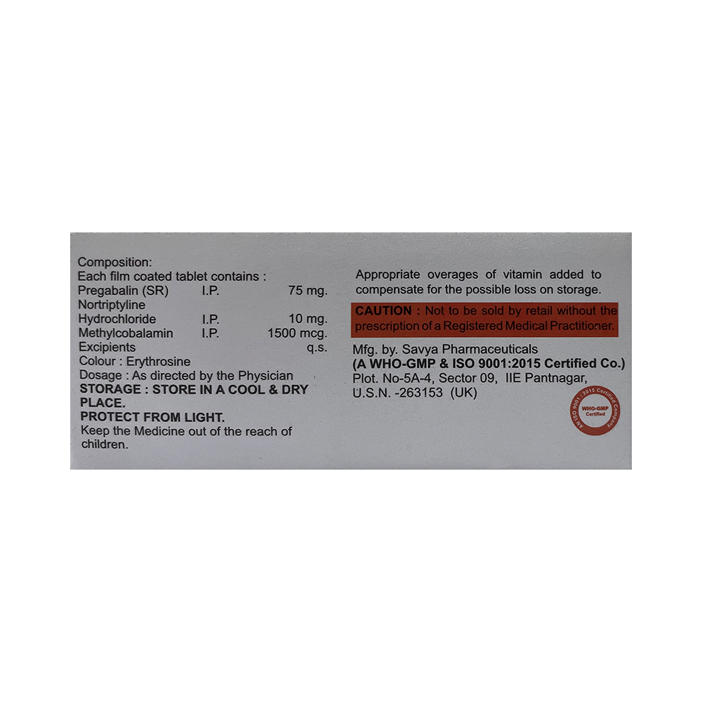 Salt Composition: Pregabalin (75mg) + Nortriptyline (10mg) + Methylcobalamin (1500mcg)