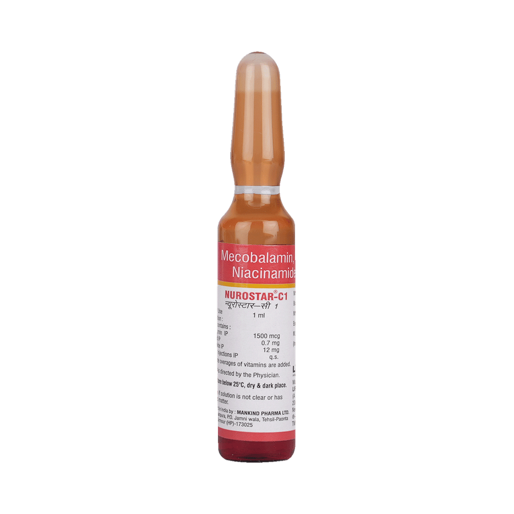 Nurostar C 1 Injection is a combination medicine that is used in the treatment of nutritional deficiencies. It helps in the growth and development of the body and replenishes the body's stores of important nutrients. Nurostar C 1 Injection is given as an injection under the supervision of a doctor and should not be self-administered. The dose and how often you take it depend on what you take it for. Your doctor will decide how much you need to improve your symptoms. You should keep taking the medicine as long as it is prescribed to you.Common adverse reactions associated with Nurostar C 1 Injection include nausea, vomiting, diarrhea, and injection site reactions, such as pain, swelling, and redness. Rarely, hypersensitivity reactions, including rash, itching, and anaphylaxis, may occur. Patients should be advised to report any unusual symptoms promptly.Before receiving Nurostar C 1 Injection, let your doctor know about all the medicines you are taking to make sure it is safe for you. Nurostar C 1 Injection is contraindicated in patients with a known hypersensitivity to any of the active ingredients or excipients. It should not be used in patients with cobalt or cyanocobalamin allergy. Additionally, it is contraindicated in patients with megaloblastic anemia due to vitamin B12 deficiency without concurrent folate deficiency.