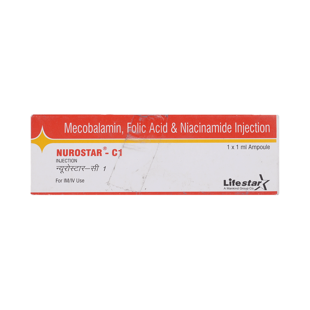 Nurostar C 1 Injection is a combination of essential B-complex vitamins that support vital body functions. Folic acid helps in DNA synthesis and red blood cell formation. Methylcobalamin (vitamin B12) plays an important role in nerve function and red blood cell production, helping prevent B12 deficiency-related anemia. Niacinamide (vitamin B3) contributes to energy metabolism and overall cellular function. Together, these vitamins help maintain nerve health, aid in red blood cell formation, and support overall well-being.