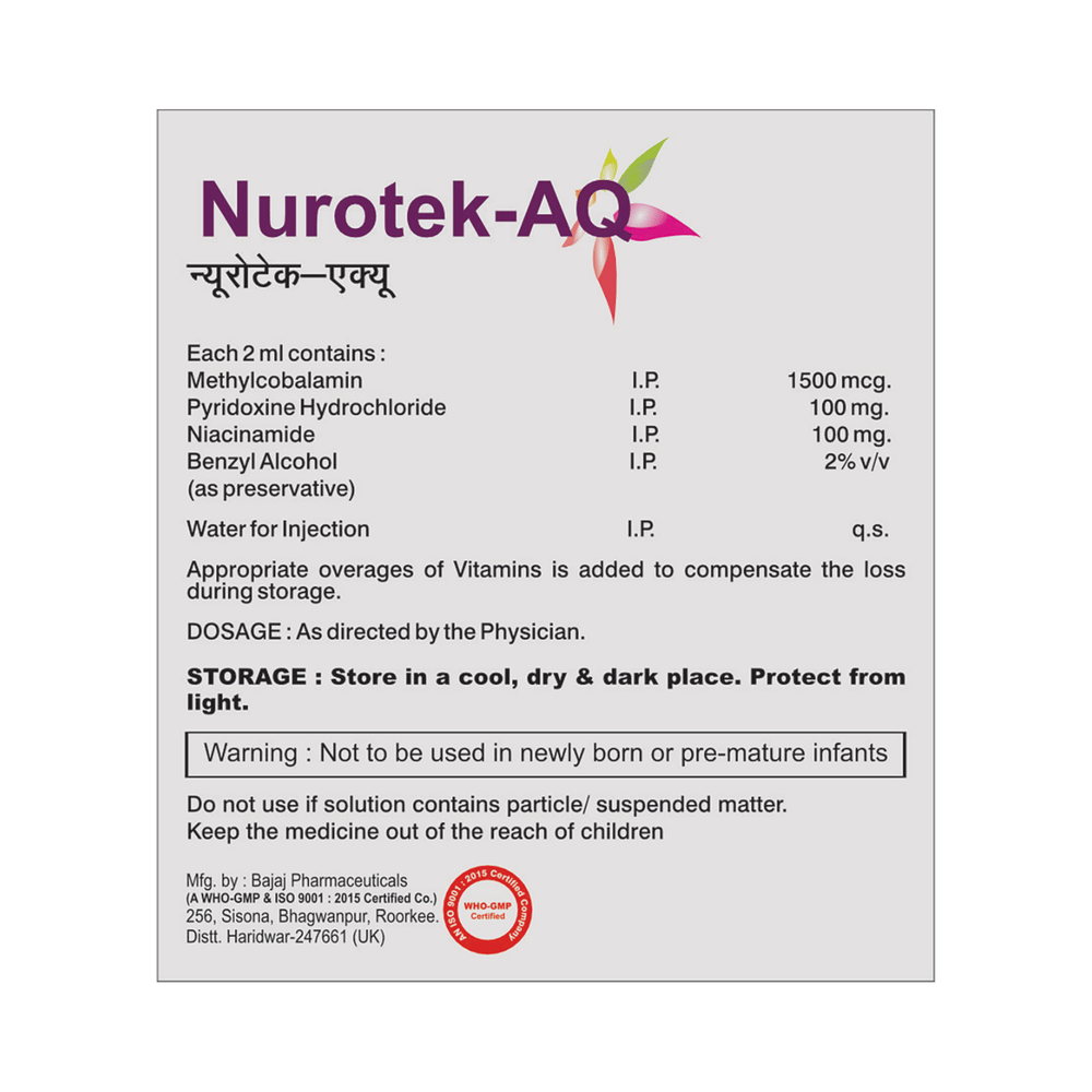 Nurotek-AQ Injection is a supplement medicine that helps treat vitamin and other nutritional deficiencies. It ensures the proper growth and functioning of the body. Nurotek-AQ Injection is administered under the supervision of a healthcare professional. Do not self-administer this injection. Inform your doctor if you have any known allergies to this medication.You may experience symptoms of injection site reactions such as redness, swelling, and pain. Usually, they go away with time but do consult your doctor if these symptoms persist for a longer duration. Inform your doctor if you are suffering from any disease or are taking any other medicines.