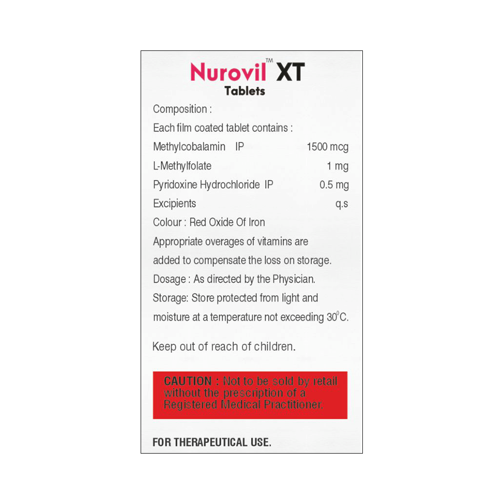 Nurovil XT Tablet is a combination medicine that is used in the treatment of nutritional deficiencies. It helps in the growth and development of the body and replenishes the body's stores of important nutrients. Nurovil XT Tablet may be taken with or without food. Take it in the exact dose and duration as prescribed by your doctor. Take the medicine at a fixed time to help you remember to take it. Do not take more than the recommended dose.Nurovil XT Tablet is generally well tolerated and does not usually cause side effects. However, if you experience any symptoms while on treatment with Nurovil XT Tablet, let your doctor know. If you experience any symptoms of severe allergic reactions like swelling, itching, difficulty breathing, and hives, contact your doctor immediately.Before taking Nurovil XT Tablet, let your doctor know if you have any preexisting medical conditions. Do not take medicine if you have a known history of allergic reactions to any components in Nurovil XT Tablet. This medicine is generally safe for pregnant and breastfeeding women.