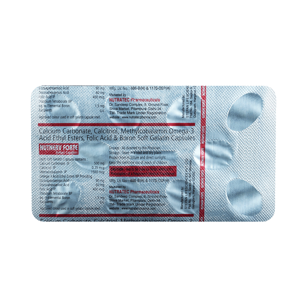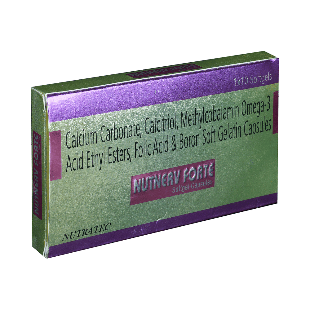 Nutnerv Forte Soft Gelatin Capsule is a combination medicine used in the treatment of nutritional deficiencies such as low blood calcium levels. It helps in the proper growth and development of cells and brain It also promote healthy bones, muscles, nervous system, and heart. Nutnerv Forte Soft Gelatin Capsule can be taken with or without food. It is advised to consume plenty of water with this medicine to avoid dehydration. It should be used in the dose and duration as prescribed by your doctor. It is advised to take this medicine at a fixed time. This medicine should not be taken in more than the recommended dose.This is usually a safe medicine with very minimal side effects. Some common side effects include nausea, diarrhea, constipation, fatigue, and pain in upper abdomen. Contact your doctor immediately if you notice any symptoms of allergic reactions like swelling, itching, difficulty in breathing, hives, etc.Before taking this medicine, tell your doctor if you have any other health conditions like kidney diseases as dose adjustment may be required. Inform your doctor if you are taking any other medicines or if you are pregnant or breastfeeding. It is advised not to consume alcohol after taking this medicine.