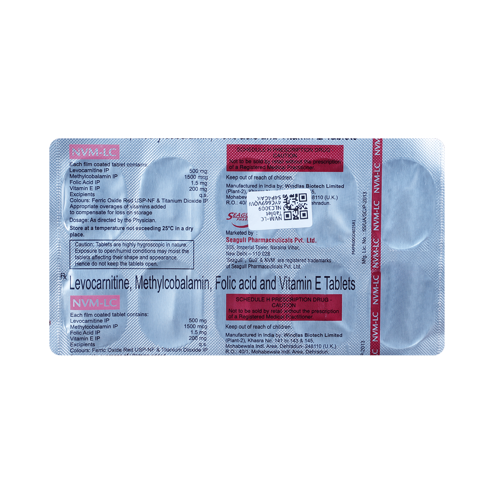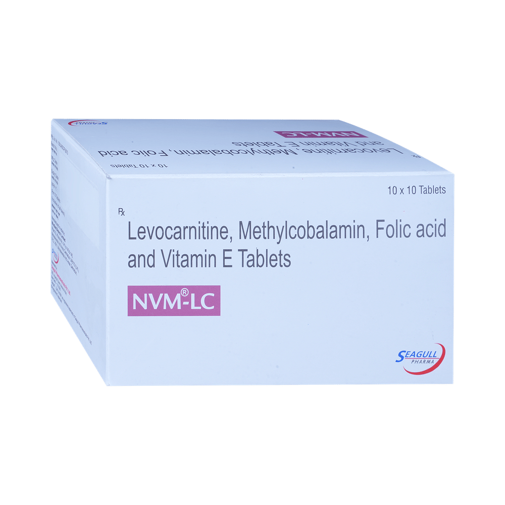 NVM-LC Tablet is a combination of vitamin B9, B12, levocarnitine, and vitamin E. Folic acid is essential for production of red blood cells. It prevents and treats folate deficiency and anemia. When taken by pregnant women, Folic acid prevents miscarriage, preterm labor, and neural tube defects in infants. Levo-carnitine helps turn the fats present in ingested food into energy. Methylcobalamin corrects vitamin B12 deficiency thereby helping in treating certain anemias and nerve problems. Vitamin E protects body tissues from damage caused by free radicals. It keeps the immune system strong against viruses and bacteria.