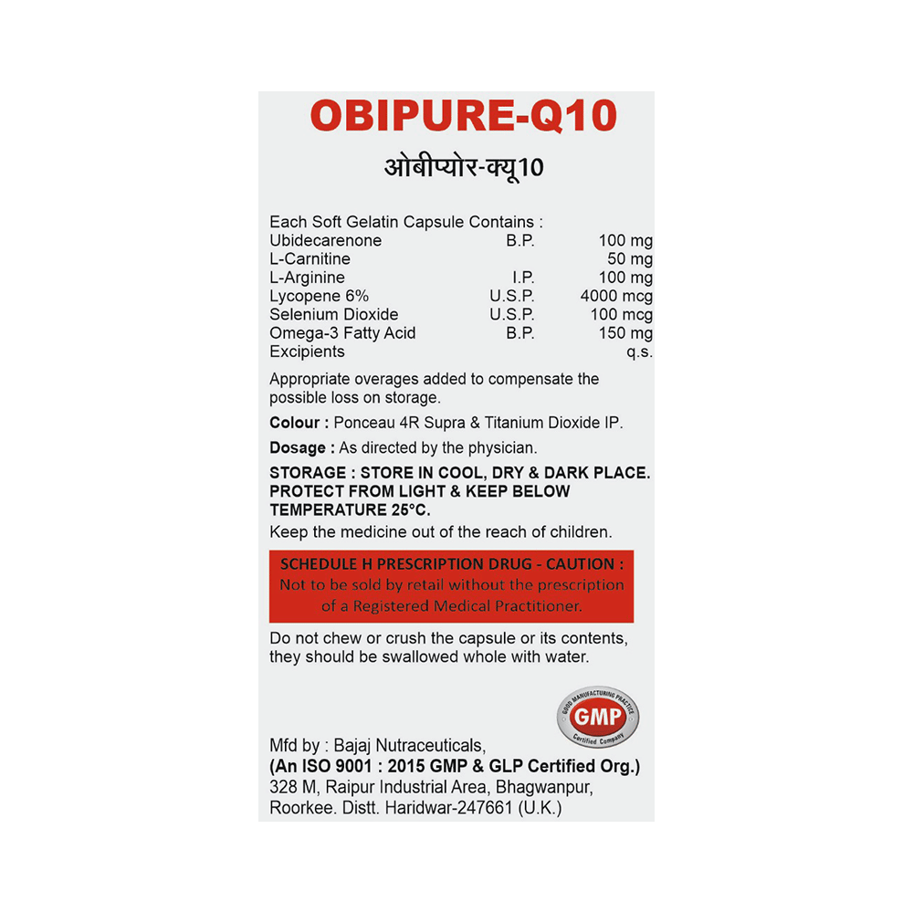 Obipure-Q10 Softgel Capsule is a combination of six nutritional supplements. Obipure-Q10 Softgel Capsule, Levo-carnitine, L-Arginine, and Lycopene are naturally occurring compounds that provide proper nutrition for adequate growth and development. Selenium is a trace element that helps the proper functioning of the immune system. Omega-3 fatty acid provides daily nutrition, also keeps the heart healthy. Thus, Obipure-Q10 Softgel Capsule helps to fulfill the dietary deficiencies.