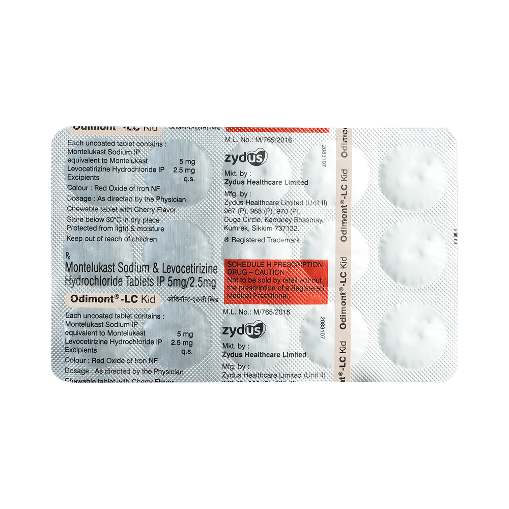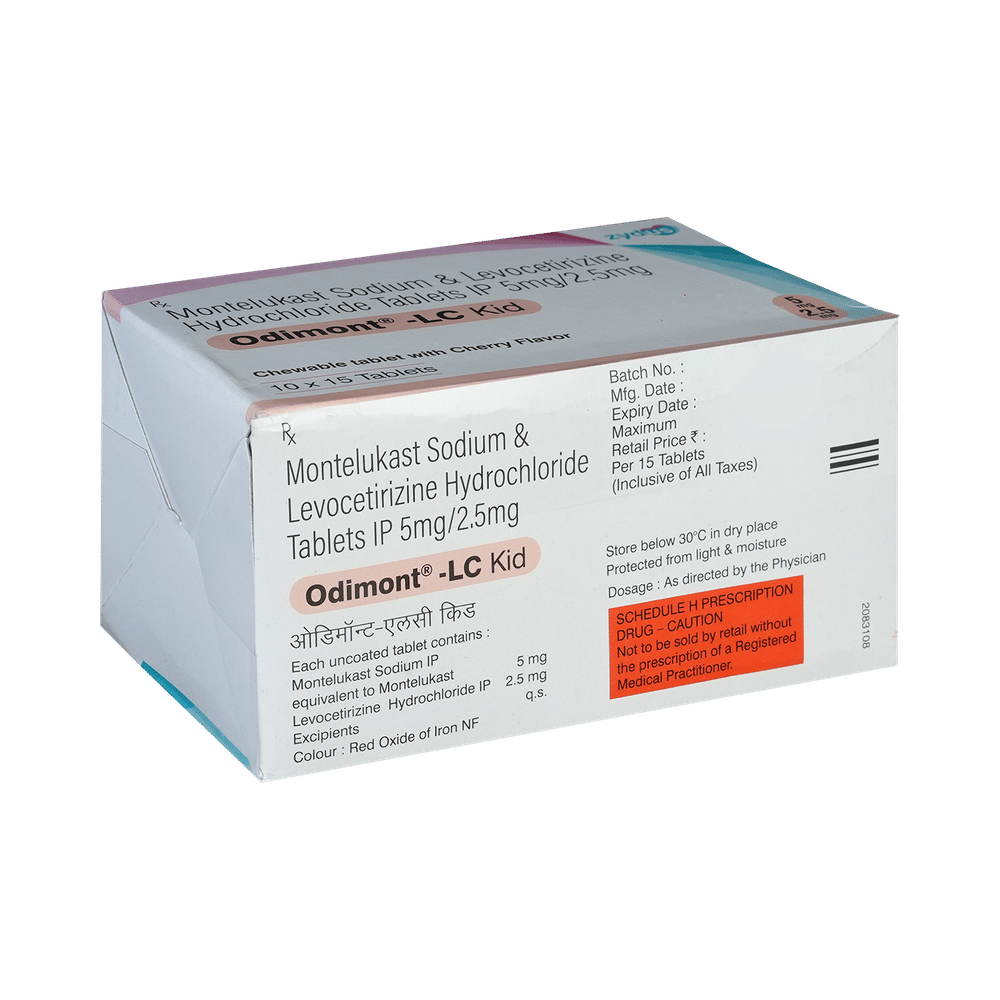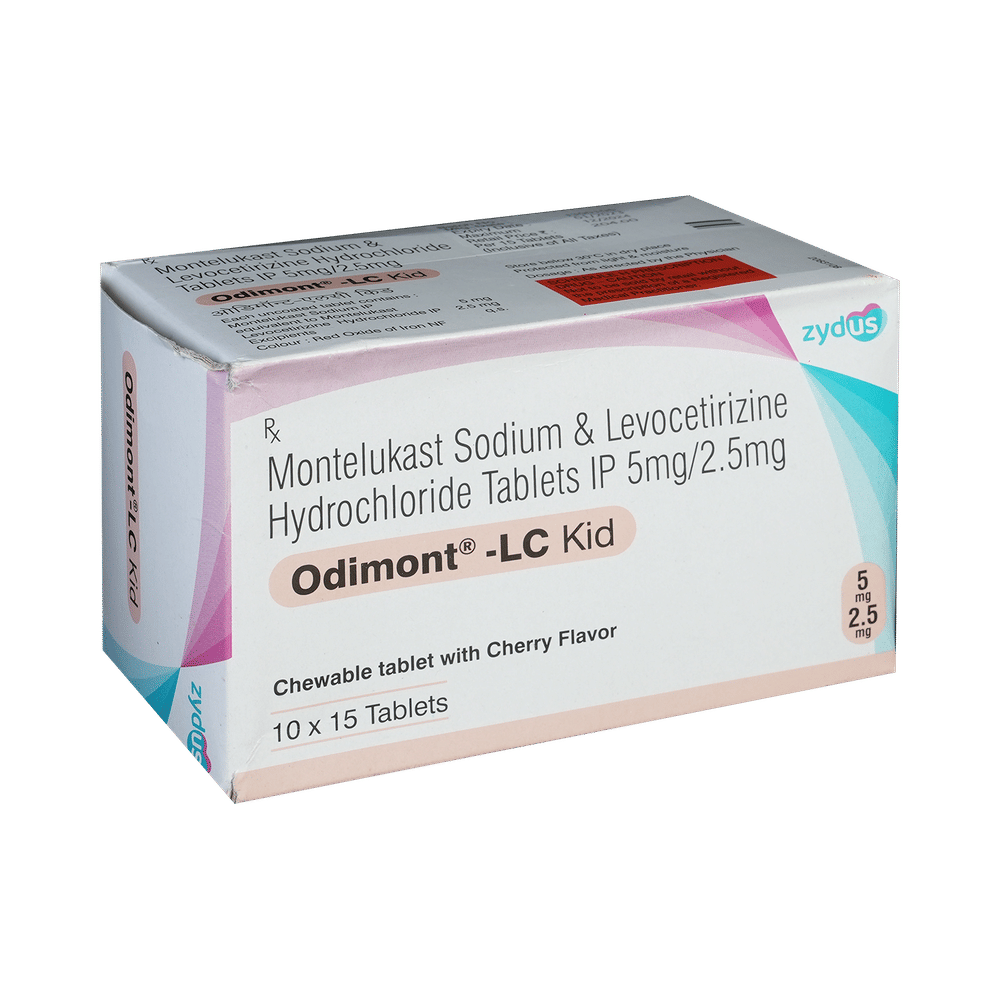Odimont-LC Kid Tablet is commonly prescribed in children to treat symptoms of allergy such as runny nose, sneezing, itching, swelling, congestion, and watery eyes. It may also help in the treatment of asthma and skin allergies. Give this medicine to your child at a fixed time before or after food in the prescribed dose, time, and way. For asthma, prefer giving Odimont-LC Kid Tablet in the evening or 2 hours before physical activity. For allergy, it is best to give it either in the morning or in the evening, depending upon the time of onset of symptoms. In case your child has both, prefer giving it in the evening. If your child vomits within 30 minutes of taking this medicine, give the same dose again, but skip it if it’s already time for the next dose.Your child may start to feel better after a few regular doses. However, you must still complete the prescribed dose to ensure maximum benefit. Moreover, stopping the medicine abruptly may worsen your child’s condition. This medicine may cause some minor and temporary side effects like vomiting, diarrhea, nausea, dizziness, dry mouth, rash, and headache. Usually, these episodes subside once your child’s body adapts to the medicine. However, in case these effects persist or start bothering your child, consult your child’s doctor without any delay.Let your child’s doctor know if your child is already taking any medicines. Also, narrate your child’s complete medical history, including any prior episodes of allergy, heart problem, blood disorder, vascular disorders, birth defects, airway obstruction, lung anomaly, skin disorder, liver impairment, and kidney malfunction. This information is critical for dose alterations and in planning your child’s overall treatment.