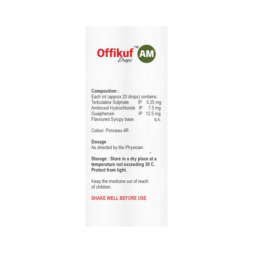 Offikuf AM Oral Drops contains three active medicines. Each ingredient present in this medicine plays a pivotal role. Ambroxol is a mucolytic that thins and loosens mucus (phlegm), making it easier to cough out. Guaifenesin is an expectorant that decreases the stickiness of the mucus and helps in its removal from the airways. Terbutaline is a bronchodilator that relaxes and widens the muscles in the airways. Together, they offer overall relief from the cough.