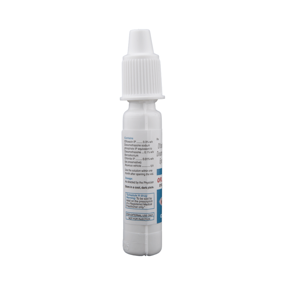 Oflox-D Eye Drop is a combination of two medicines: Ofloxacin and Dexamethasone. Ofloxacin is an antibiotic which prevents bacterial cells from dividing and repairing, thereby killing the bacteria. This treats your eye infection. Dexamethasone is a steroid which blocks the production of certain chemical messengers (prostaglandins) that make the eye red, swollen and itchy.