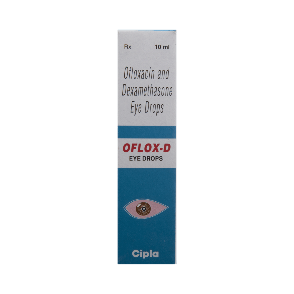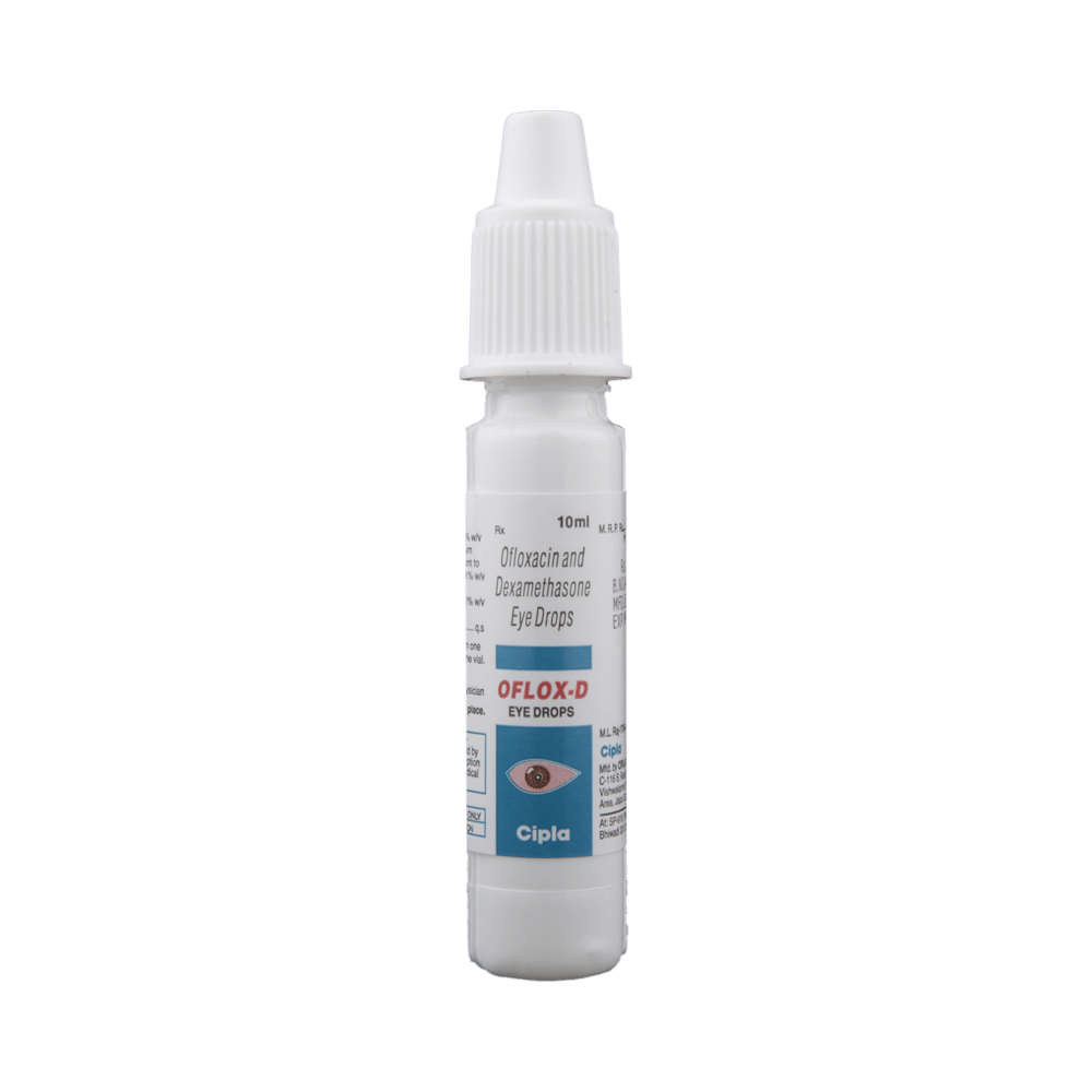 Oflox-D Eye Drop is a prescription medicine used in the treatment of bacterial infections of the eye. It stops the growth of bacteria and helps in relieving redness, itching, and swelling. This way it treats the infection relieves your symptoms. Oflox-D Eye Drop is to be used only in the affected eye in the dose and duration as advised by the doctor. Wash your hands before using this medicine. It is advised to check the label for directions before use. Do not skip any doses and finish the full course of treatment even if you feel better. Stopping the medicine too early may lead to the infection returning or worsening.The most common side effects include discomfort and irritation at the application site. If these side effects persist for a longer duration, inform your doctor. In case by accident, this medicine goes into your ears, nose, or mouth, immediately rinse it off with water. Inform your doctor if you are allergic to any of the ingredients of this medicine or taking any other medication. It is advised not to drive or operate heavy machinery after using this medicine as it may cause temporary blurring of vision.