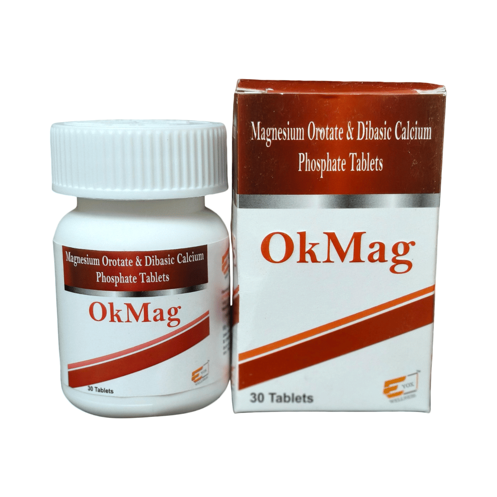 OkMag Tablet is a combination of dibasic calcium phosphate and magnesium orotate. Dibasic calcium phosphate prevents or treats low blood calcium levels by acting as a source of calcium. Magnesium orotate is an organic mineral salt composed of two synergic protective components: orotic acid (OA) and magnesium. It works as a mineral supplement to treat magnesium deficiency. Orotic acid transports magnesium into the cells. By providing calcium and magnesium, OkMag Tablet improves musculoskeletal, cardiovascular, and neurological function in individuals with low magnesium and calcium levels.
