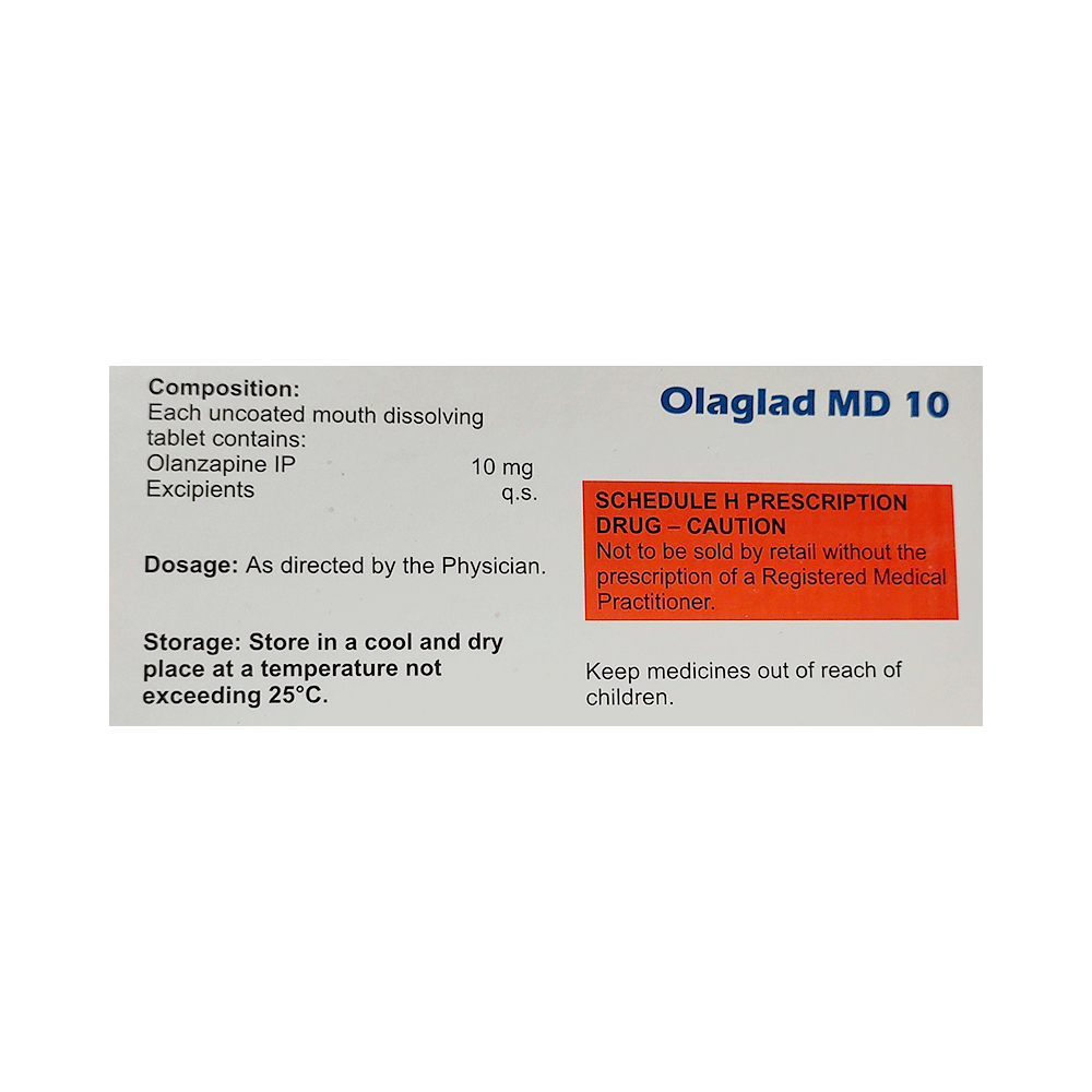 Olaglad MD 10 Tablet is used in the treatment of schizophrenia (a mental disorder that can result in hallucinations or delusions and also adversely affects a person’s ability to think and behave) and mania. Olaglad MD 10 Tablet may be taken with or without food. However, it is advised to take it at the same time each day as this helps to maintain a consistent level of medicine in the body. Take this medicine in the dose and duration as advised by your doctor and if you have missed a dose, take it as soon as you remember. This medication mustn't be stopped suddenly without talking to your doctor as it may worsen your symptoms.Some common side effects of this medicine include dryness in the mouth, constipation, muscle rigidity, and restlessness. Initially, this medicine may cause a sudden drop in blood pressure when you change positions, so it is better to rise slowly if you have been sitting or lying down. It also causes dizziness and sleepiness, so do not drive or do anything that requires mental focus until you know how this medicine affects you.However, this medicine may increase your weight, blood sugar, and cholesterol levels but, modifying your lifestyle by having a healthy diet and exercising regularly can reduce this side effect. You should be cautious as in rare cases it may cause serious side effects like very high blood sugar levels or seizures.