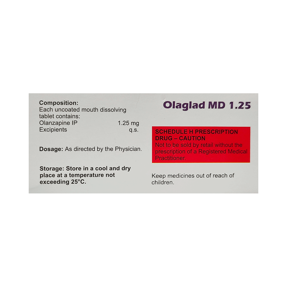 Olaglad MD 1.25 Tablet is used in the treatment of schizophrenia (a mental disorder that can result in hallucinations or delusions and also adversely affects a person’s ability to think and behave) and mania. Olaglad MD 1.25 Tablet may be taken with or without food. However, it is advised to take it at the same time each day as this helps to maintain a consistent level of medicine in the body. Take this medicine in the dose and duration as advised by your doctor and if you have missed a dose, take it as soon as you remember. This medication mustn't be stopped suddenly without talking to your doctor as it may worsen your symptoms.Some common side effects of this medicine include dryness in the mouth, constipation, muscle rigidity, and restlessness. Initially, this medicine may cause a sudden drop in blood pressure when you change positions, so it is better to rise slowly if you have been sitting or lying down. It also causes dizziness and sleepiness, so do not drive or do anything that requires mental focus until you know how this medicine affects you.However, this medicine may increase your weight, blood sugar, and cholesterol levels but, modifying your lifestyle by having a healthy diet and exercising regularly can reduce this side effect. You should be cautious as in rare cases it may cause serious side effects like very high blood sugar levels or seizures.